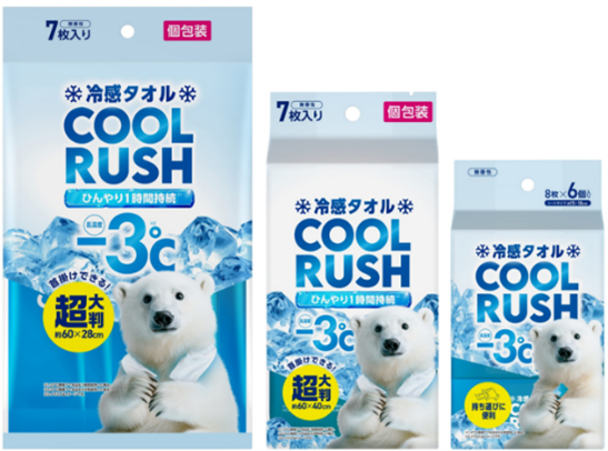 今回発売する「冷感タオル COOL RUSH」シリーズは、肌を拭いた際に肌温度から約3℃低く(※3)感じられる清涼感が特長です。2種類のクール成分(メントール・乳酸メンチル)を配合し、ひんやりとした感覚が約1時間持続(※4)します。