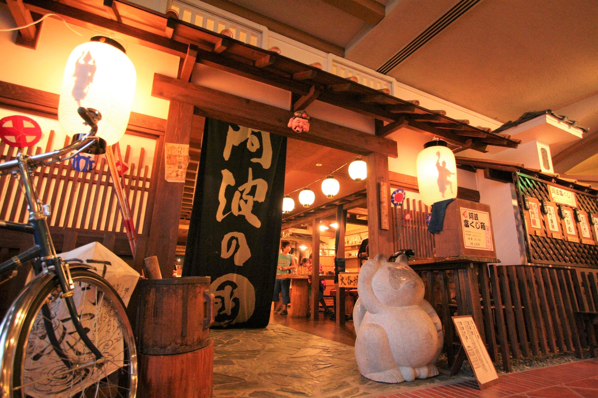 館内1階「阿波の國」では、縁日遊びや駄菓子屋さん狸堂、大谷焼の絵付け、江戸時代から伝わる“天然灰汁(あく)発酵建て” 阿波本藍染めなどのご当地プログラムが体験できます。