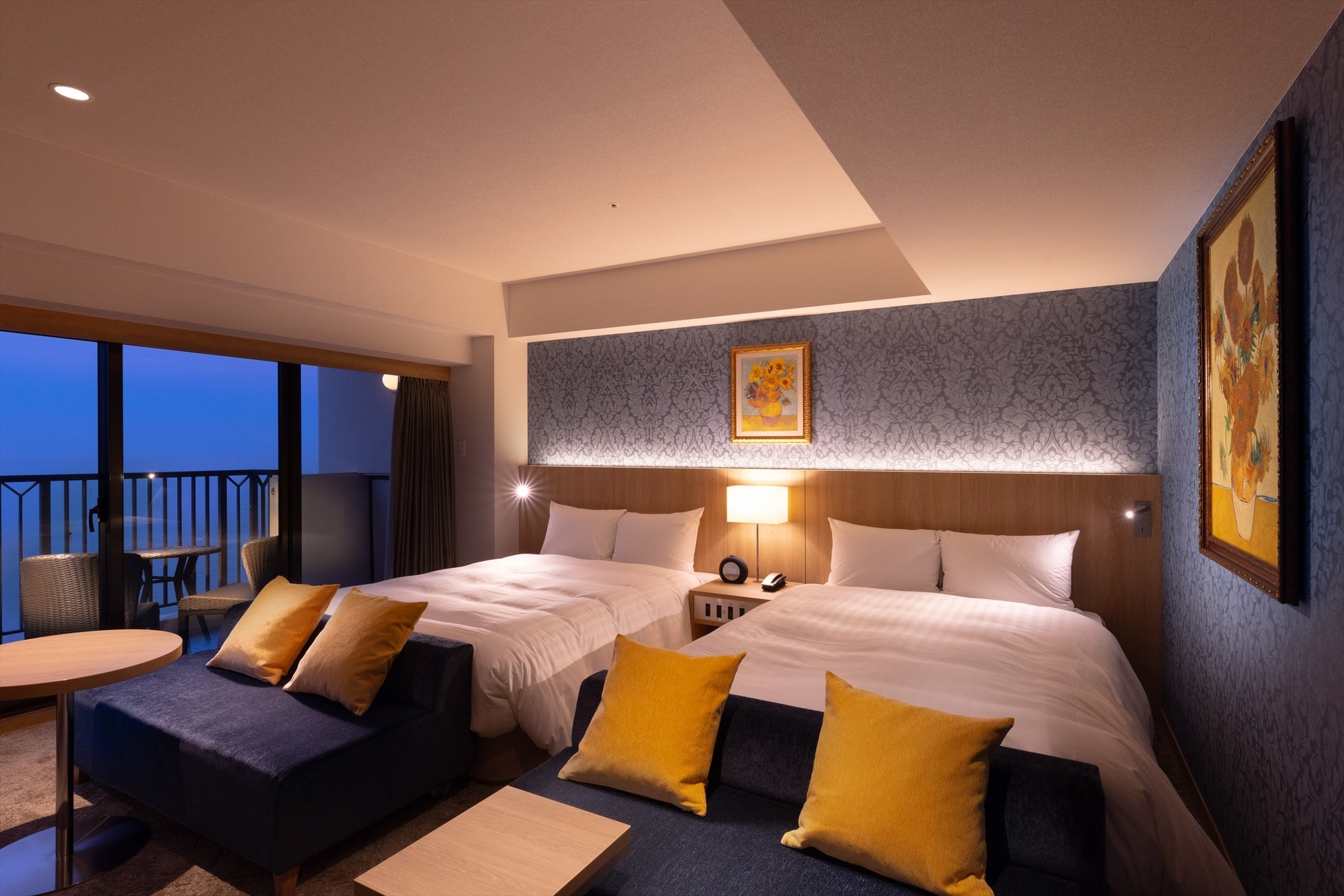 海を見晴らす洋室や和室、徳島の匠による阿波藍ルームなど旅のスタイルで選べる客室は15タイプ。2024年3月、徳島が誇る伝統工芸「大谷焼」アートプレートが彩る客室、7月には泊まれるアートギャラリー「ゴッホのヒマワリルーム」が誕生。