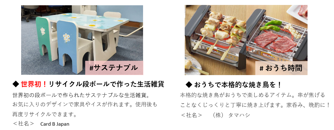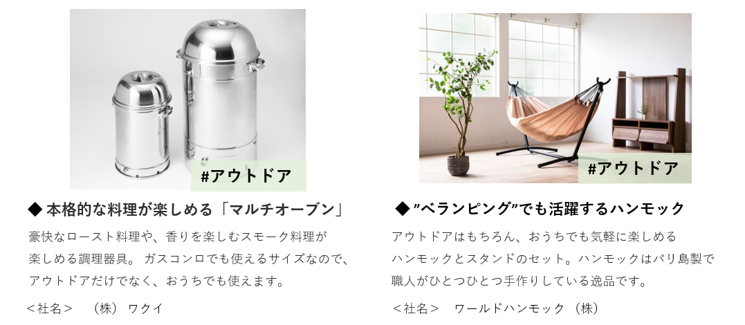 【サステナブル】【おうち時間】【アウトドア】【アイディアグッズ】など注目テーマで出展製品をご紹介します。この他にも、あらゆるテーマの製品が出展しておりますのでぜひ、お問合せください。