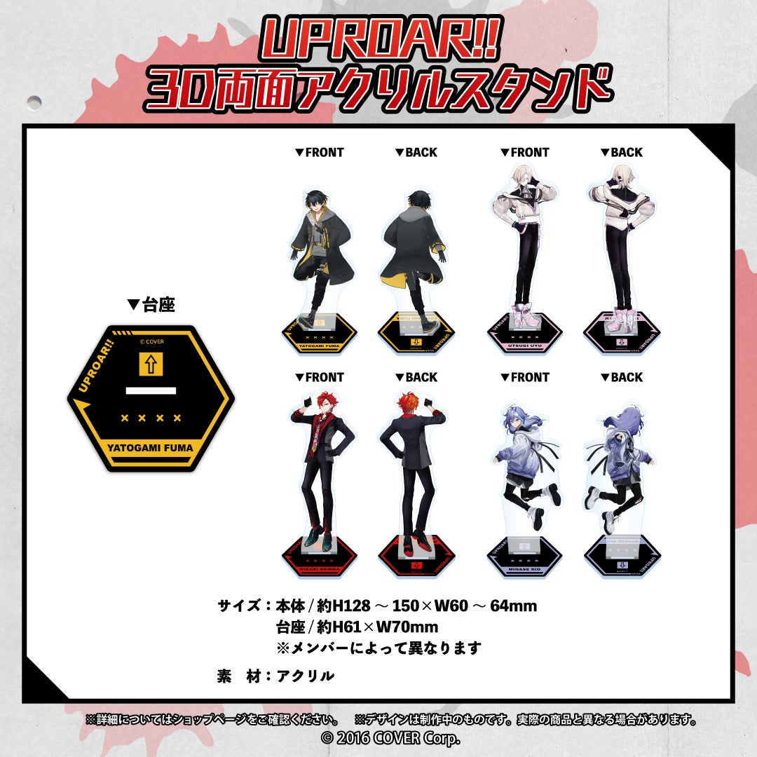 後ろ姿もプリントされた3D両面アクリルスタンドの他、《UPROAR!!》メンバー各々が考案したグッズをご用意いたしました。