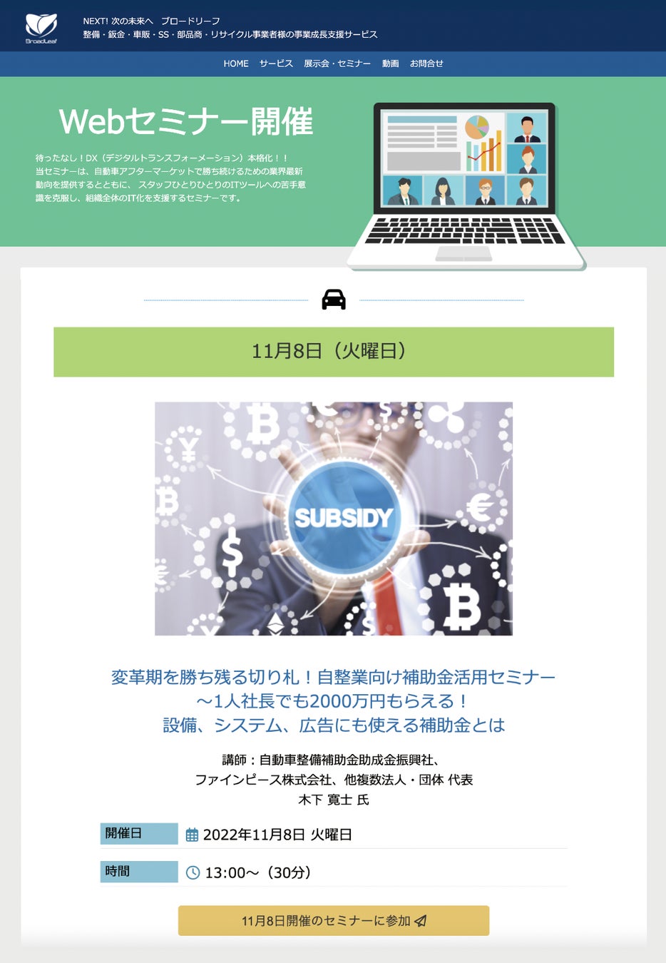 ファインピース株式会社(本社:東京都新宿区、代表取締役:木下寛士)のグループで自動車整備・鈑金塗装業界に特化した財務コンサルタント(補助金助成金活用支援)を行う自動車整備補助金助成金振興社(略称:AMS、https://www.subsidyassociation.com/ )は、11月8日に開催するWEBセミナーの無料参加の受付を開始した。