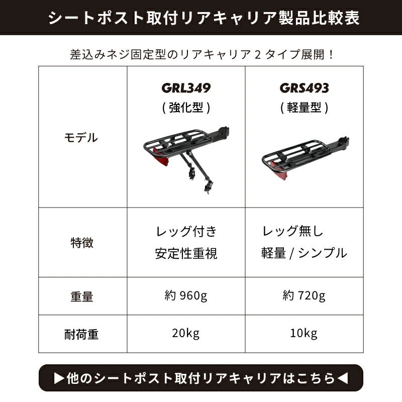 ロングライドや重い荷物の運搬に最適なGRL349 シートポスト取付リアキャリアです。