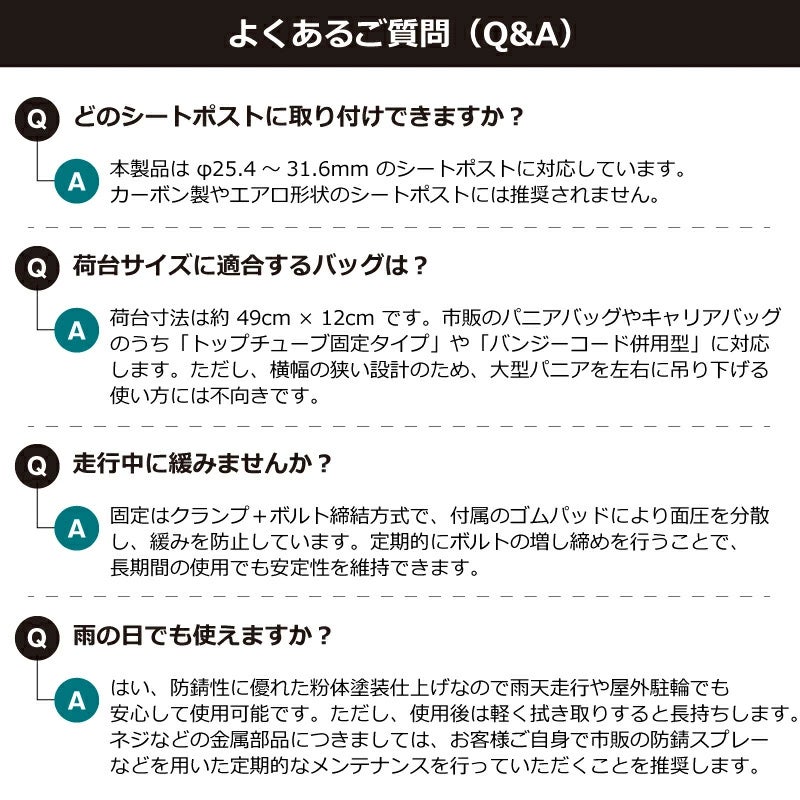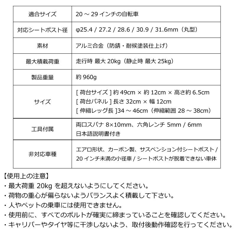 ・最大荷重 20kg を超えないようにしてください。 ・荷物の重心が偏らないようバランスよく積載して下さい。 ・人やペットの乗車には使用できません。 ・使用前に、すべてのボルトが確実に締まっていることを確認してください。 ・キャリパーやタイヤ等に干渉しないよう、取付後動作確認を行ってください。 |