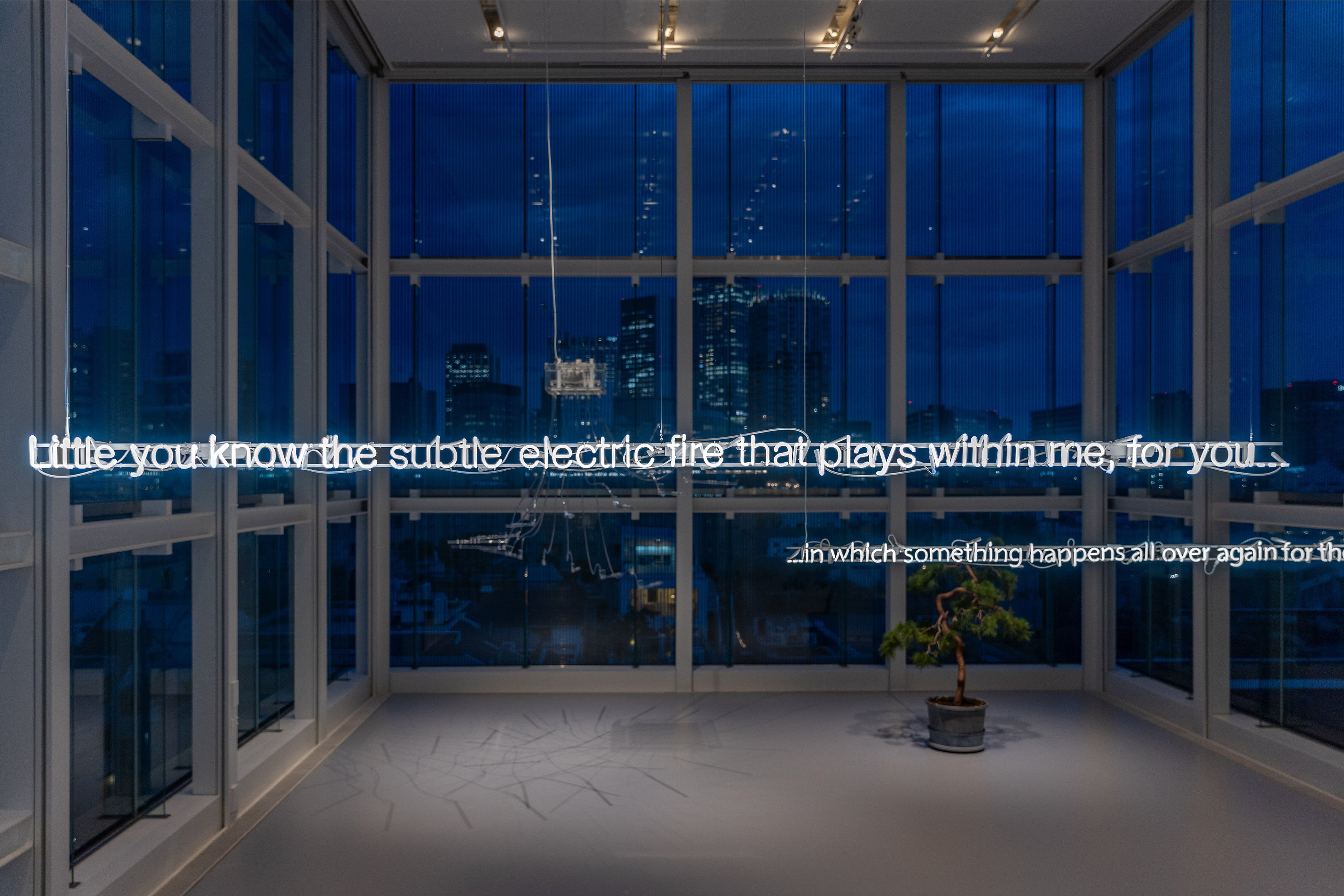 テキストとネオンを用いた作品は、自らの作品もその一部を成す「間テクスト性」を脱構築しようとする試みを上手く表現しています。例えば、ラテン語の回文を用いた作品では、シャンデリアのように吊るされたネオンの文字が丸く円を作り、支持体となっているガラスに反射して幾重にも重なり合います。エヴァンスは翻訳の問題についても取組んでいます。コンピュータに接続されている光が、その画面に流れていくウィリアム・ブレイクの詩や、フェミニスト理論家のジュディス・バトラー、神学者のミシェル・ド・セルトー、あるいはマルキ・ド・サドからの引用文をモールス信号の点滅で伝えるのです。光を用いて不明瞭なステートメントを伝えるという手法に象徴されるような矛盾を顕在化させるのがこの作家の特徴です。彼の見方では、詩は「実験のエキゾチシズム」と呼ばれるものから生まれ、その多義性の重なりの中で、事実とフィクション、現実とその分身、打ち立てられた確信と矛盾した感情などの間にある曖昧な領域を探求することができるのです。
