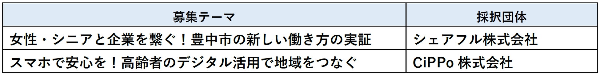 今年は、「女性・シニアと企業を繋ぐ!豊中市の新しい働き方の実証」と「スマホで安心を!高齢者のデジタル活用で地域をつなぐ」という2つのテーマで事業者を募集したところ、28件の応募があり、選考の結果、下記の2団体を採択しました。今後、市をフィールドに実証実験を行い、新たなソリューションや仕組みの確立をめざします。成果については今年度内にとりまとめ、公表する予定です。