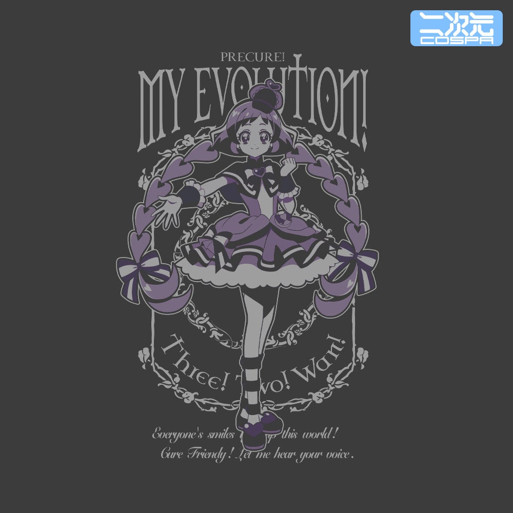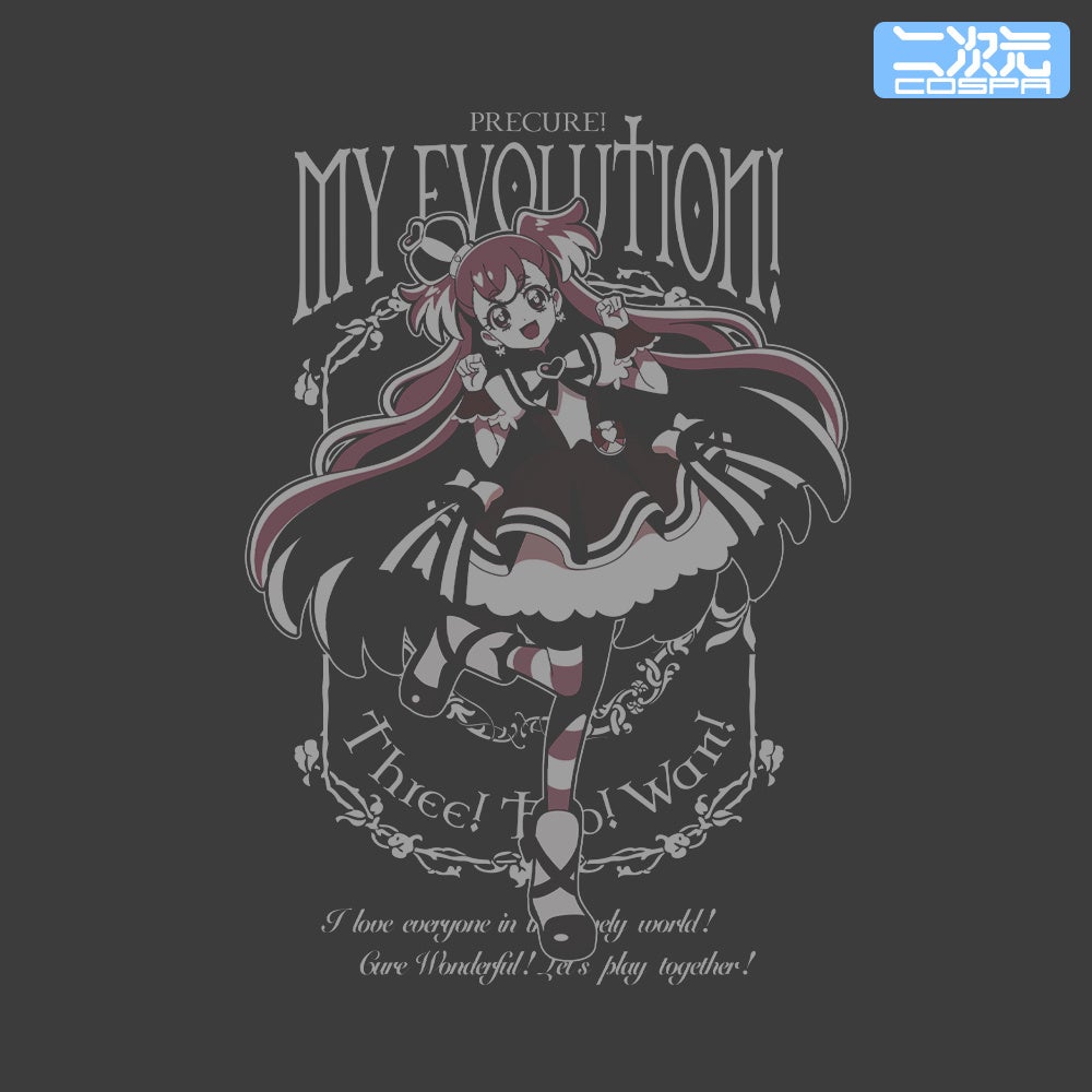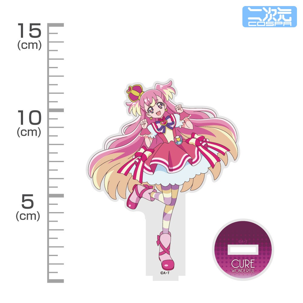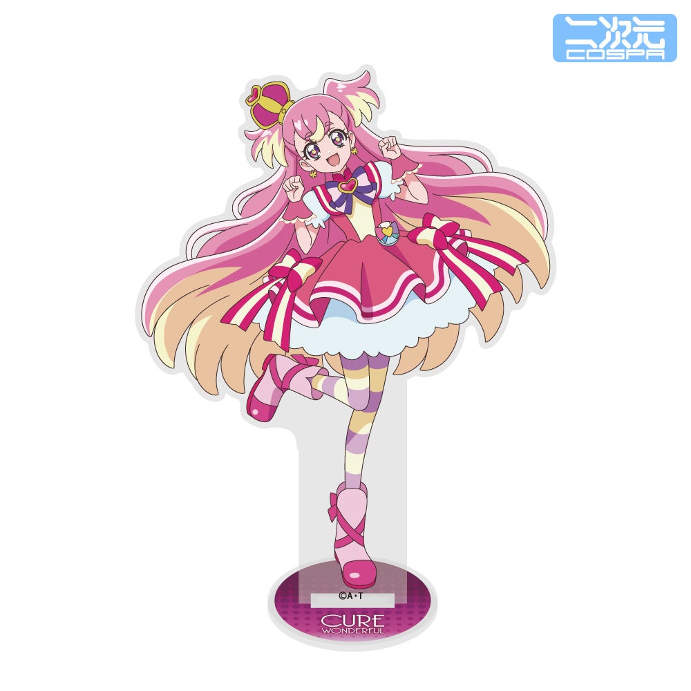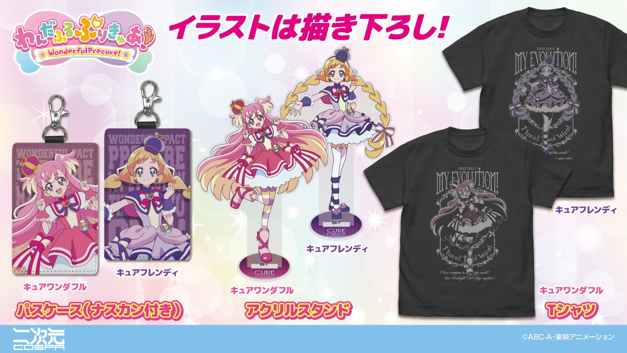 描き下ろしイラストを使用した、「キュアワンダフル」「キュアワンダフル」のTシャツ、アクリルスタンド、パスケースが二次元コスパから登場。