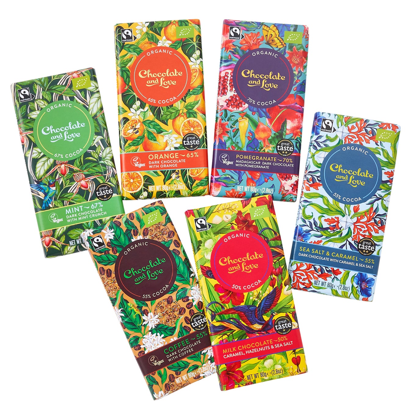 Chocolate and Love 80g(ミルクヘーゼルナッツ、オレンジ、ザクロ、コーヒー、シーソルト&キャラメル、ミント) 各864円