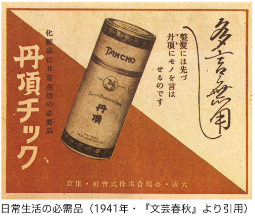 香料にラベンダーを使用した国内初の植物性チックは、男女を問わず歓迎され、発売翌年の1934年には市場シェア9割という異例のヒットとなりました。1935年から広告に専属モデルを登場させ、1938年の日中戦争から長く続いた戦時下においても根強い人気を保ちました。1945年6月には、空襲により本社や工場が全焼するも、戦後には物資不足の中で生産を再開し、「丹頂チック」は再び爆発的な人気を得ました。