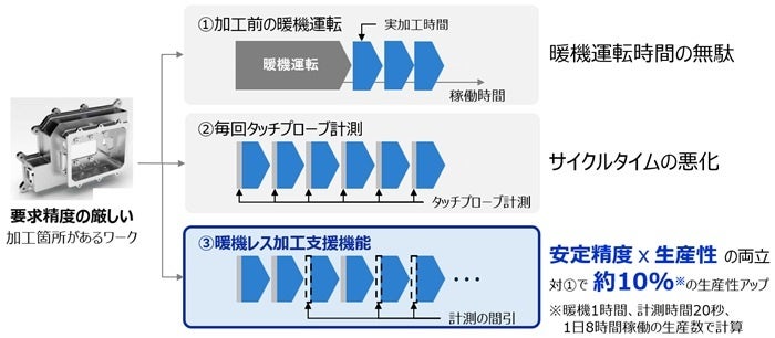 新たに追加されたオプションのタッチプローブ(*4) を利用して、暖機運転無しで安定した精度の加工を実現する、暖機レス加工支援機能を搭載。タッチプローブ計測で機械の熱によるズレ(熱変位)を補正することで、加工前の暖機運転や毎回の測定にかかる時間を減らし、サイクルタイムを短縮することが可能。