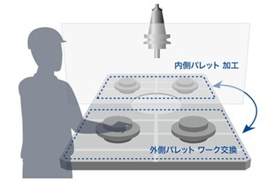 SPEEDIO Rシリーズでは、機械内部を加工エリアと段取りエリアの2つに分割し、パレットチェンジャーを搭載することで、加工中でも段取りエリアで加工物の交換を行うことが可能。パレットの回転時以外は加工が止まらないため、パレットチェンジャー非搭載のマシニングセンタと比較して機械稼働率や生産性が高い点が特長で、2014年の発売以来、多くのお客様から高い支持を得ている。