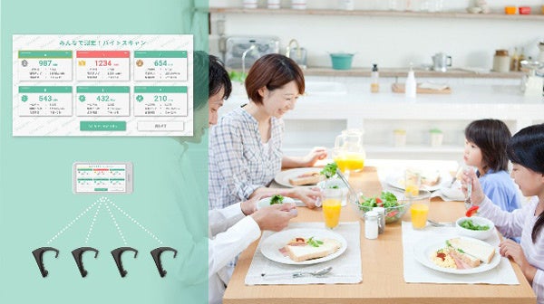 本プロジェクトでは、「bitescan」をモニター10家族に1カ月程度貸し出し、夕食時の噛む回数やテンポ、食事時間といった咀嚼行動を記録してデータを収集・蓄積します。今回使用する「bitescan」は、1台のスマートフォンで同時に複数人の咀嚼を計測できるモデルで、家族で食事をする際に全員の噛む回数をリアルタイムに表示可能です。また、プロジェクト期間前後には口腔状態測定を実施して、総合的に咀嚼に関する行動・意識の変化を分析するほか、期間中は噛むことを意識するツールとしてキシリトール配合のガムを継続して噛んでいただきます。