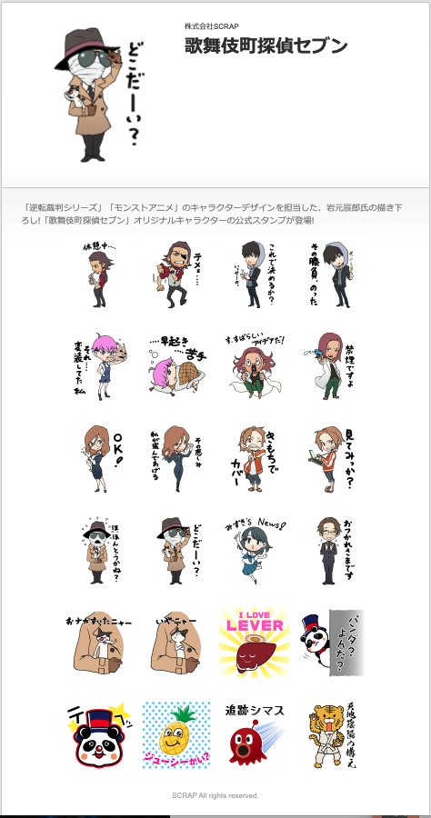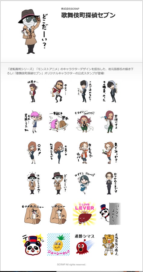 本日、12月24日(金)よりスタートするイベントを記念して、オリジナルLINEスタンプの販売が決定!「逆転裁判シリーズ」「モンストアニメ」のキャラクターデザインを担当した、岩元辰郎氏の描き下ろしイラストのLINEスタンプです。セブン探偵事務所のキャラクターやイベントに紐づいたイラスト24種類が登場。