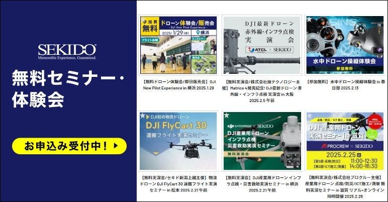 セキドでは、より多くの事業者の方にドローンを使った業務効率の改善を実現していただくため、業務用ドローンや関連ソリューションをご紹介する無料セミナーやイベントを定期的に開催しております。今後もオンラインや全国各地での開催を予定しておりますので、ご興味をお持ちのイベントにはぜひお気軽にご参加ください。