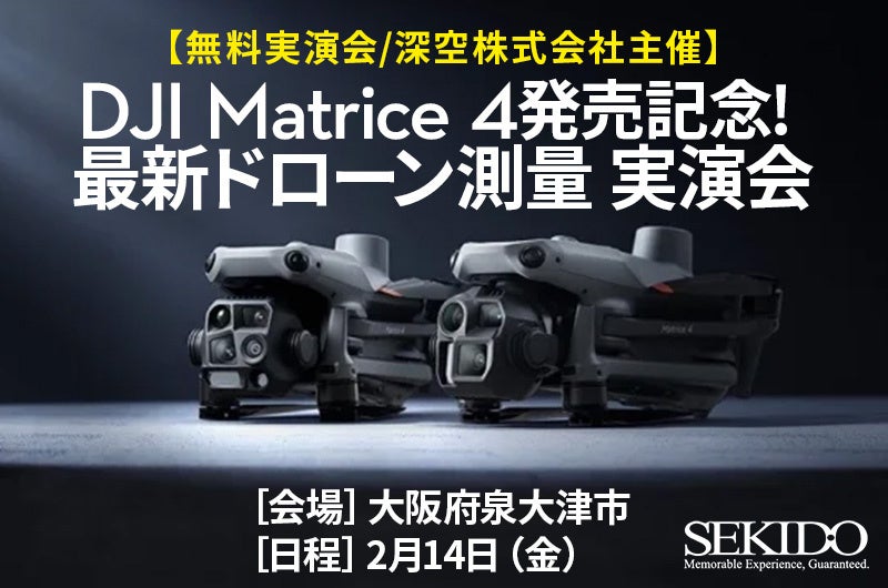 DJI(ディージェイアイ)正規販売代理店としてドローンビジネスの最先端を支える株式会社セキド(本社:東京都港区、代表取締役:⼤下貴之)では、深空株式会社(本社:大阪府大阪市、代表取締役社長:LIU WENHUI、以下「深空」)と共同で、2月14日(金)に大阪府泉大津市にて、ドローンを使った測量業務に特化した無料実演会「DJI Matrice 4発売記念!最新ドローン測量 実演会」を開催いたします。高い精度で携行性に優れた最新コンパクトドローンや、DJIの産業用フラッグシップドローンと対応する新型LiDARモジュールやカメラに加え、測位システムやマッピングソフトの性能が確認できる実演会です。測量現場を模したデモフライトでは実際の撮影データもご覧いただけるほか、補助金・助成金を活用した導入事例についてもご紹介します。既に多くの方にご参加いただいている好評の実演会ですので、ぜひお気軽にご参加ください。