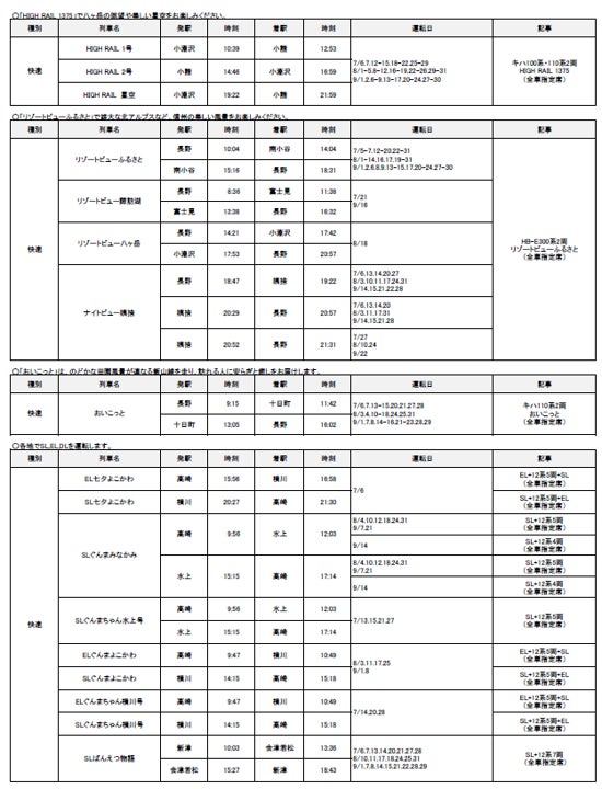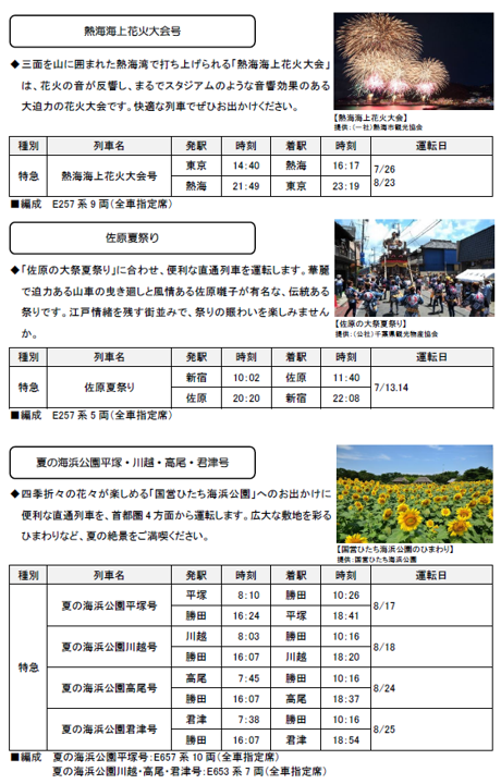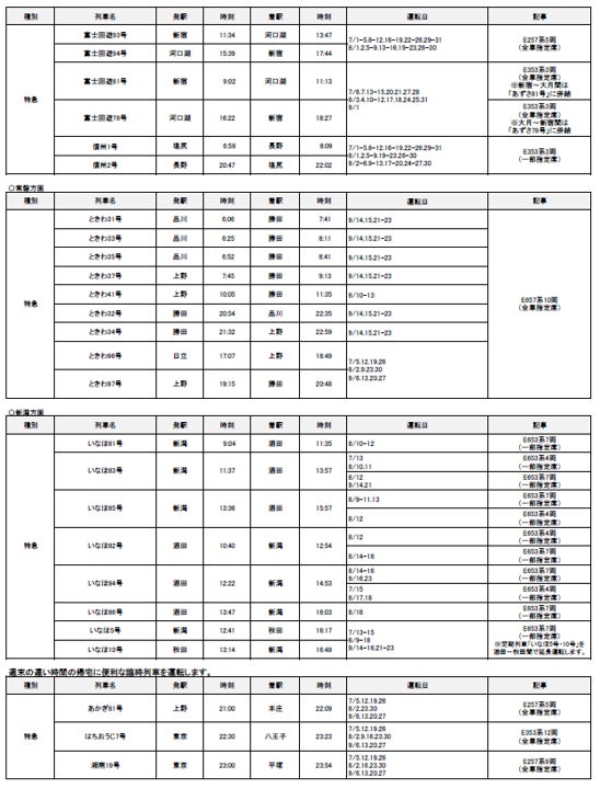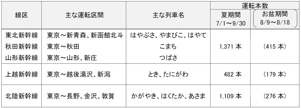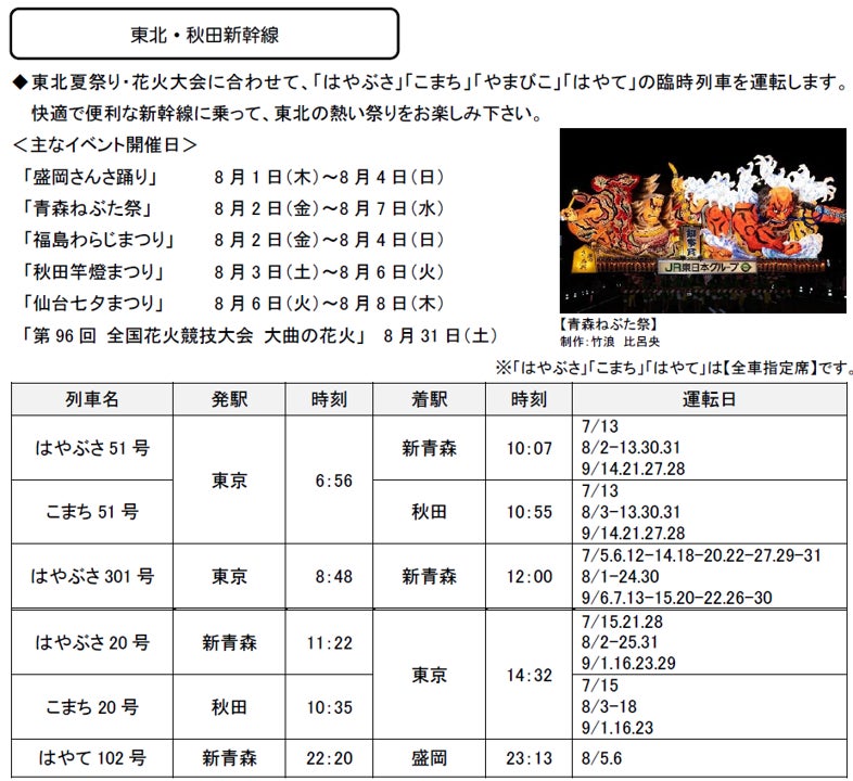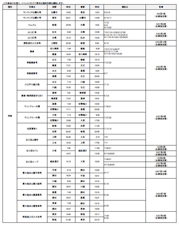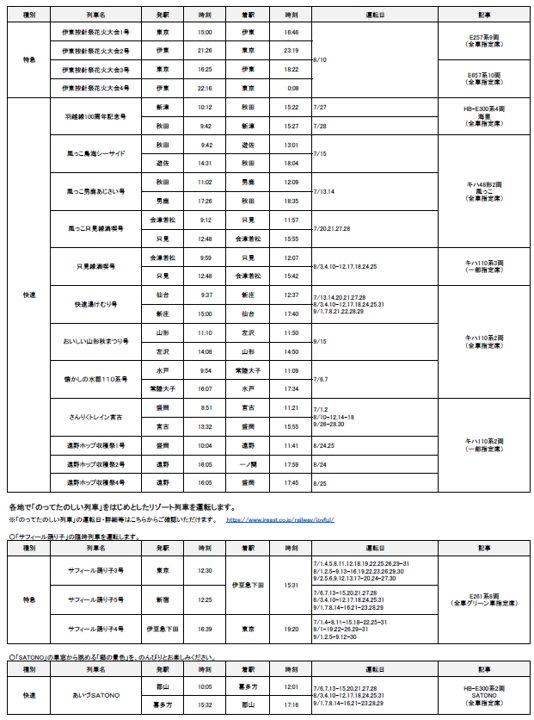 2024年7月1日(月)~9月30日(月)の期間に、各地で夏のイベントなどへのお出かけに便利な列車を運転します。また、夏休みやお盆期間を中心に、首都圏と各地を結ぶ新幹線・特急列車を増発します。 |