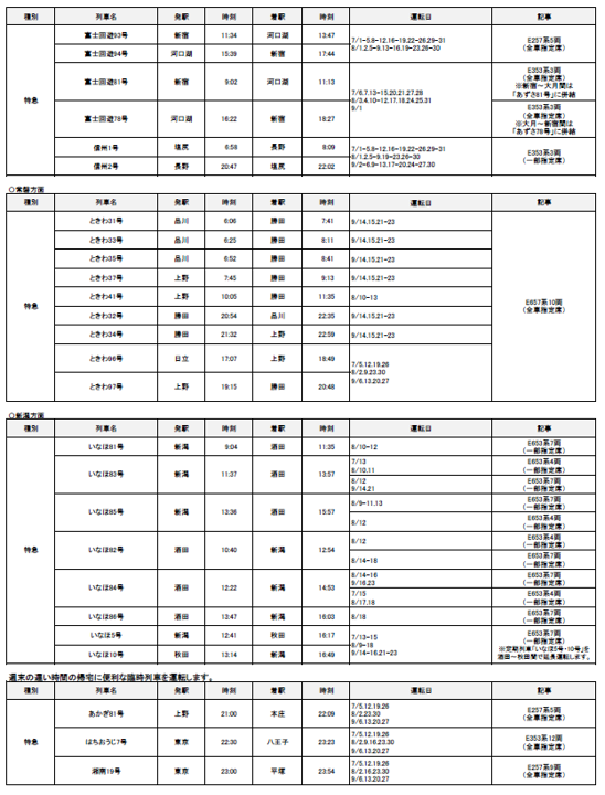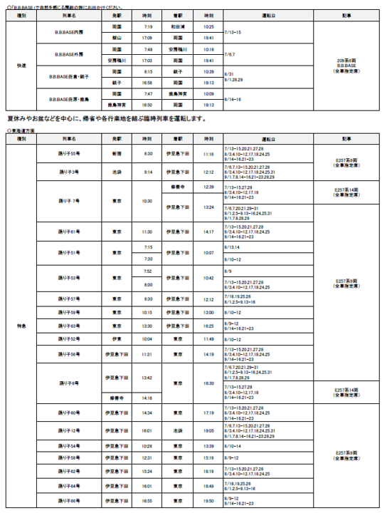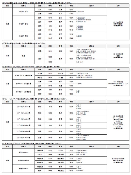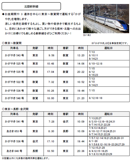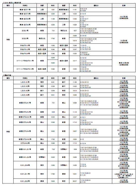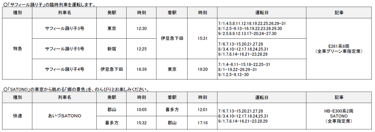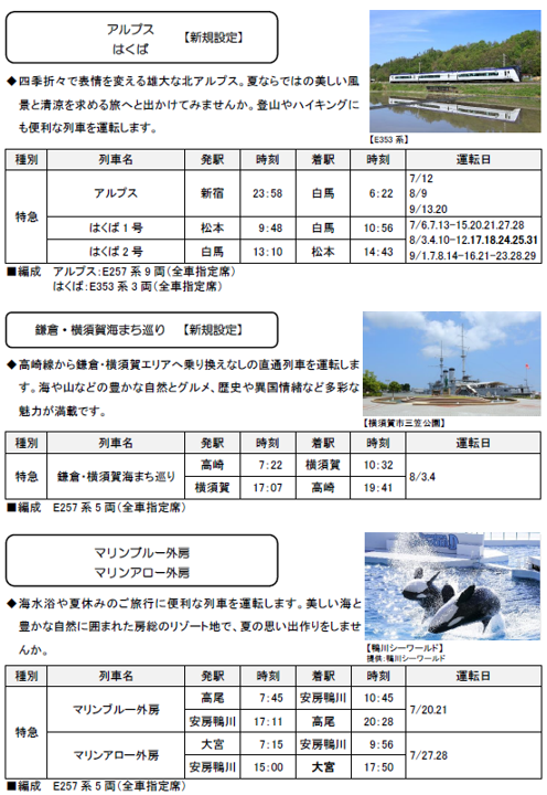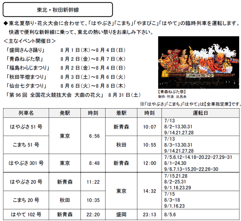 2024年7月1日(月)~9月30日(月)の期間に、各地で夏のイベントなどへのお出かけに便利な列車を運転します。また、夏休みやお盆期間を中心に、首都圏と各地を結ぶ新幹線・特急列車を増発します。 |