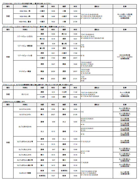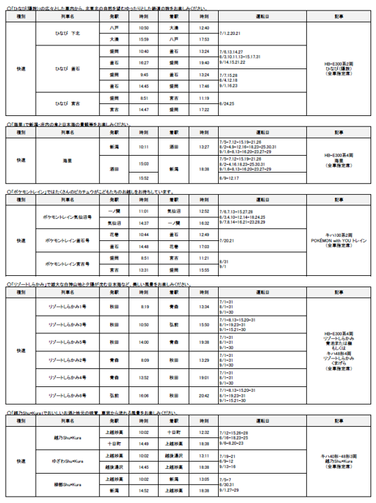 夏の臨時列車の運転について