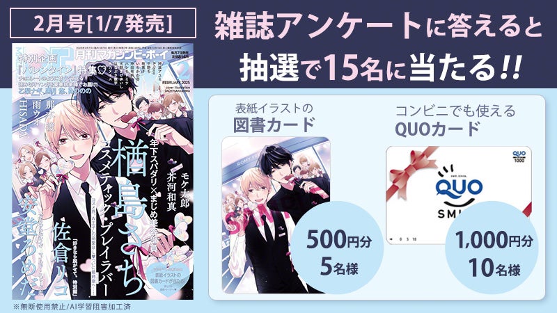 株式会社リブレ(本社:東京都新宿区、代表取締役社長:是枝由美子)は、楢島さち先生が表紙の雑誌「マガジンビーボーイ2025年2月号」を1月7日に発売いたします。https://www.b-boy.jp/magazine/223497