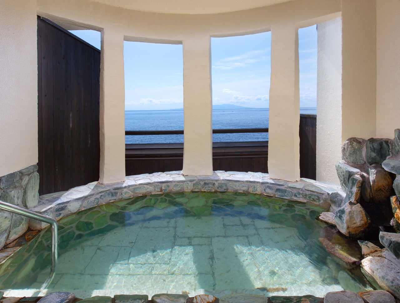 豊富な湯量(毎分300ℓ)を誇る2本の自家源泉かけ流しの湯は、温泉大浴場や露天風呂、開放的なジェットバスと半露天の岩造りの2種、計4ヶ所の貸切風呂でご堪能ください。また北川温泉名物、海抜0メートルで海と一体となれる、波打ち際の公共露天「黒根岩風呂」も当館すぐ前。ご宿泊者は入浴無料です。泉質:ナトリウム・カルシウム-塩化物泉