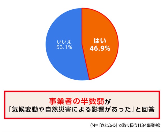 近年の「地球沸騰化」により、農作物の不作や生乳不足、海洋環境の変化による不漁や過剰な豊作など、さまざまな食材が影響を受けています。さとふるが実施したアンケート(※)では、半数弱の事業者が「猛暑など気候変動や自然災害による影響があった」と回答しました。具体的な影響として「収穫量・生産量の減少」や「(傷物が増えたなど)収穫・生産物の変化」などが挙げられています。