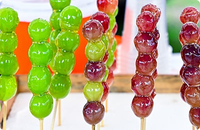 長野県で人気のぶどう3種類をランダムに串に刺し、飴でコーティングして提供します。