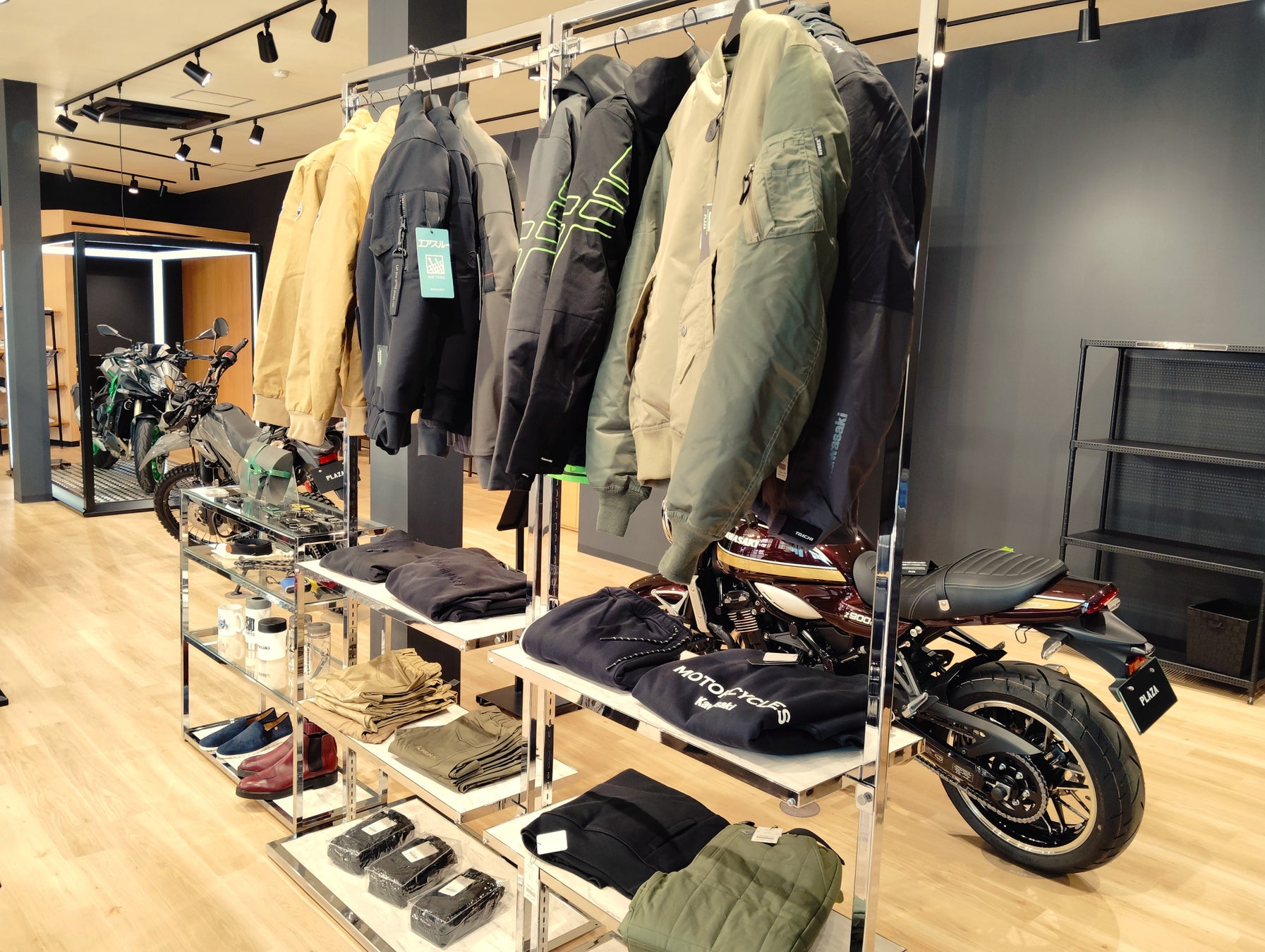 木目調のフロアと白い天井が織りなす明るい店内。モーターサイクルとプラザアパレルがゆったりと展示され、どなたでも楽しめる空間となっています。