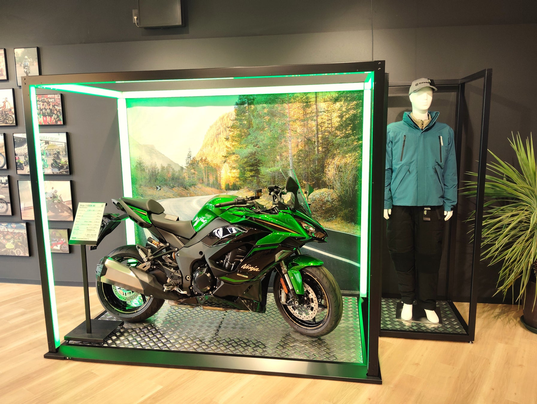新たなオーナーを待つモーターサイクルたちが、ケージの中で静かに眠りについているイメージを光の枠で創出。カワサキプラザならではのアイコニックポイントの一つです。