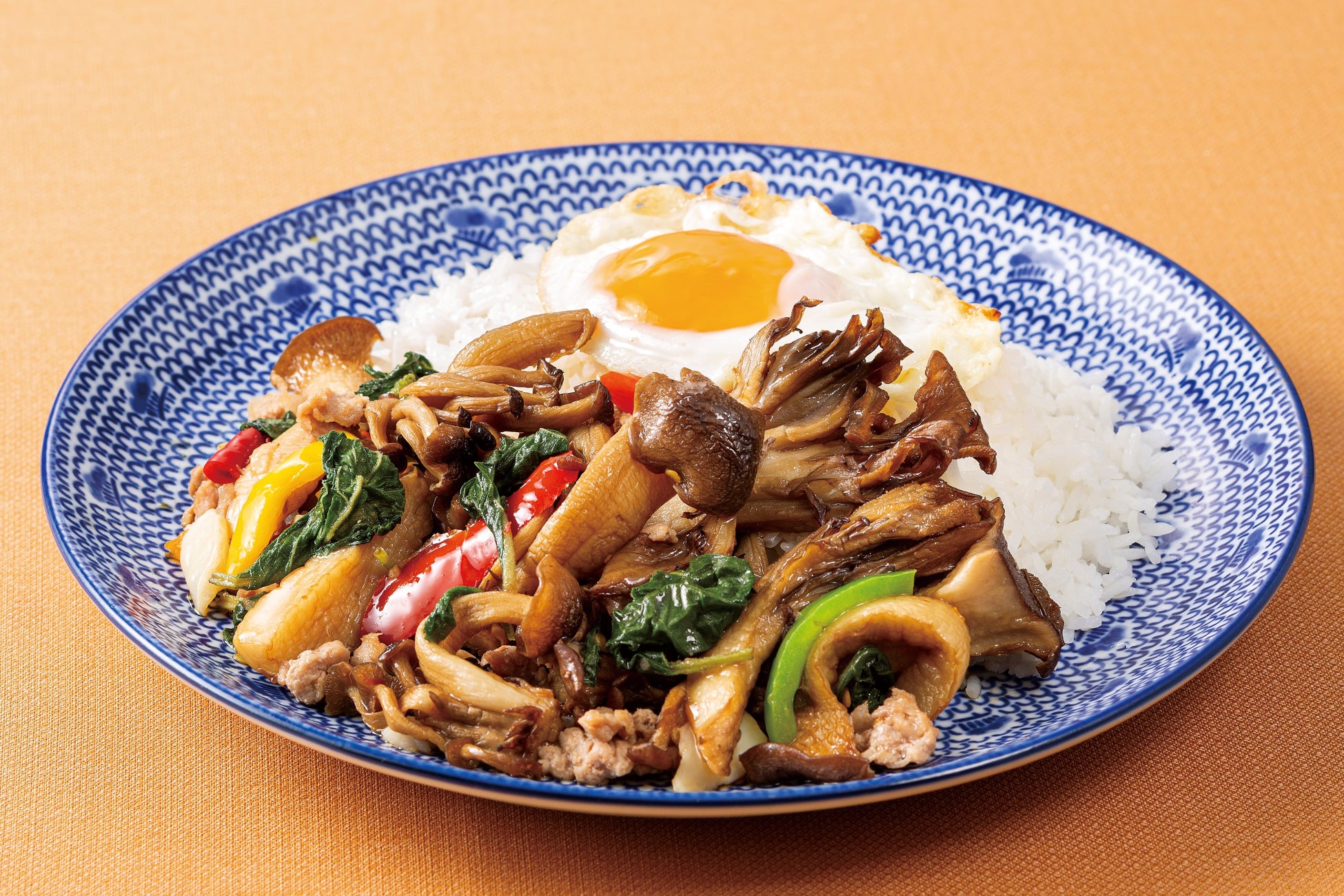 マンゴツリーで人気のスパイシーなガパオ炒めを、秋らしいたっぷりの「きのこ」でお楽しみください。