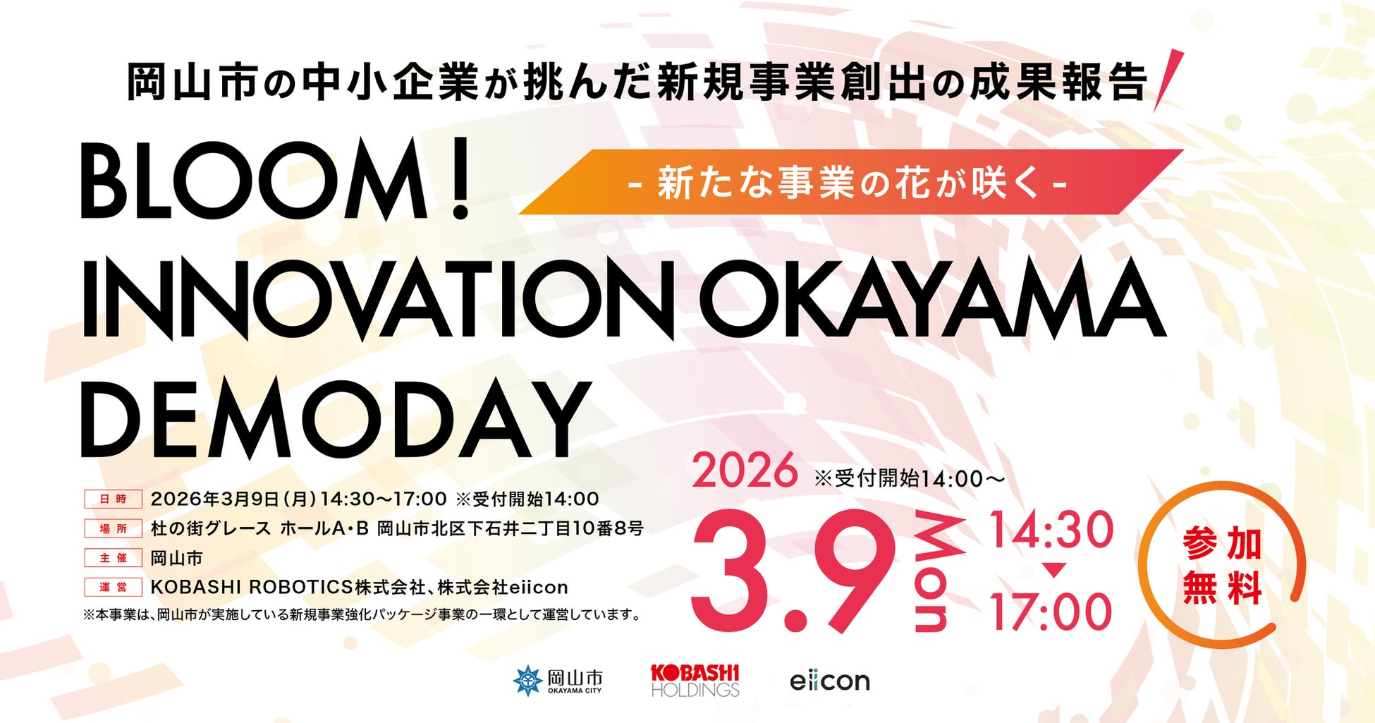 【 岡山市 × KOBASHI ROBOTICS × eiicon 】岡山市「新規事業創出強化パッケージ」合同成果報告『BLOOM! INNOVATION OKAYAMA DEMODAY』参加者募集