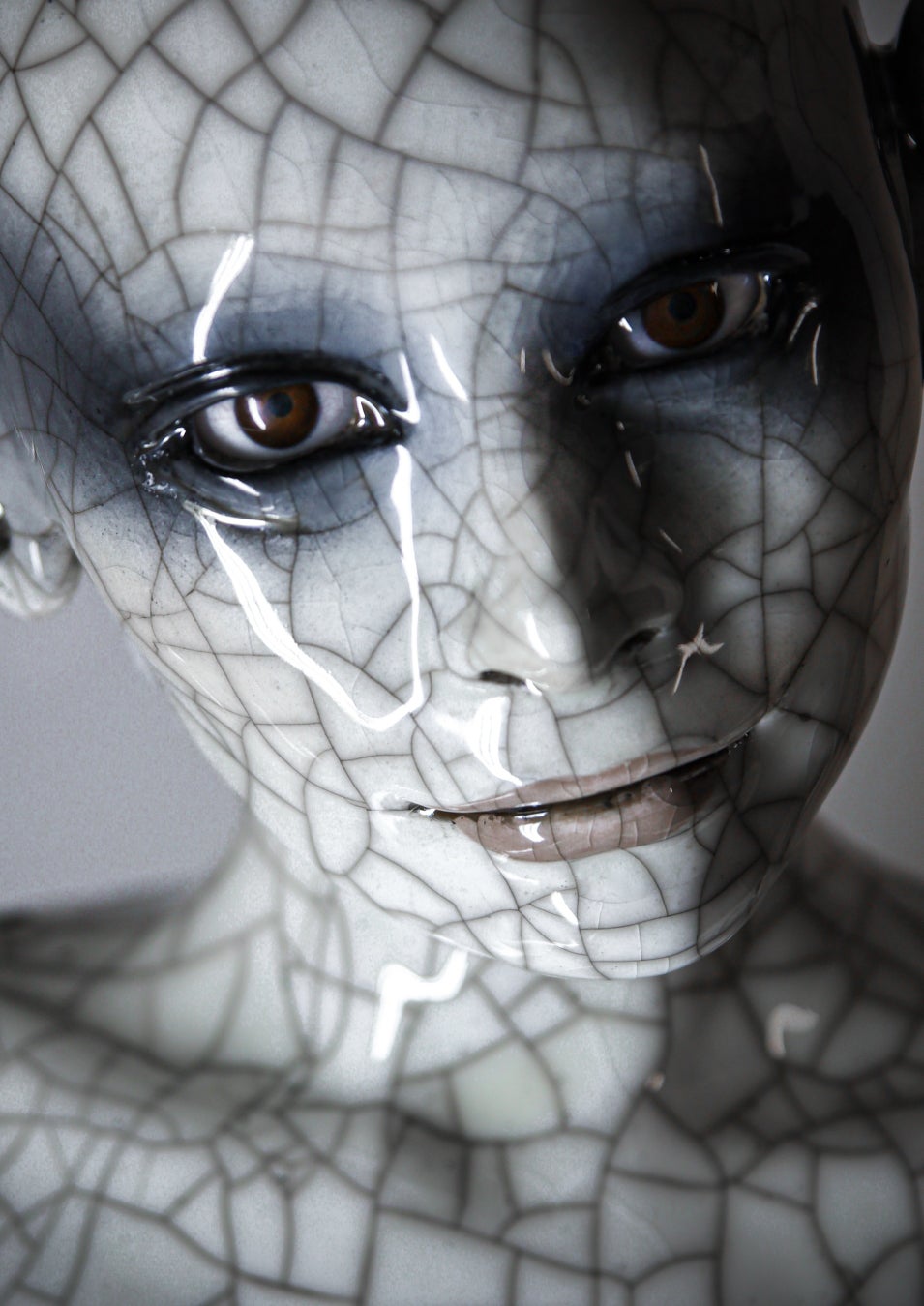 東金聖の作家人生を変えたという、「女性魔術師」から直接型を取り仕上げた彫刻。制作の過程では燃え上がる炎に投入し、作品が味わったであろう苦行を貫入釉薬で表現している。