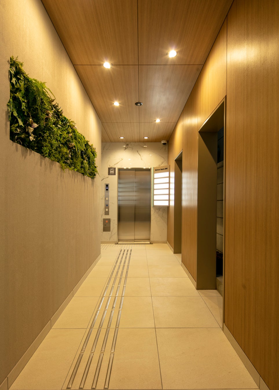 (3枚目)木目調の壁・石調タイル、グリーンアートを採用した内装