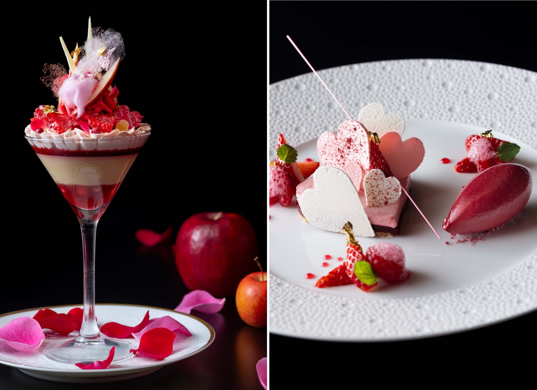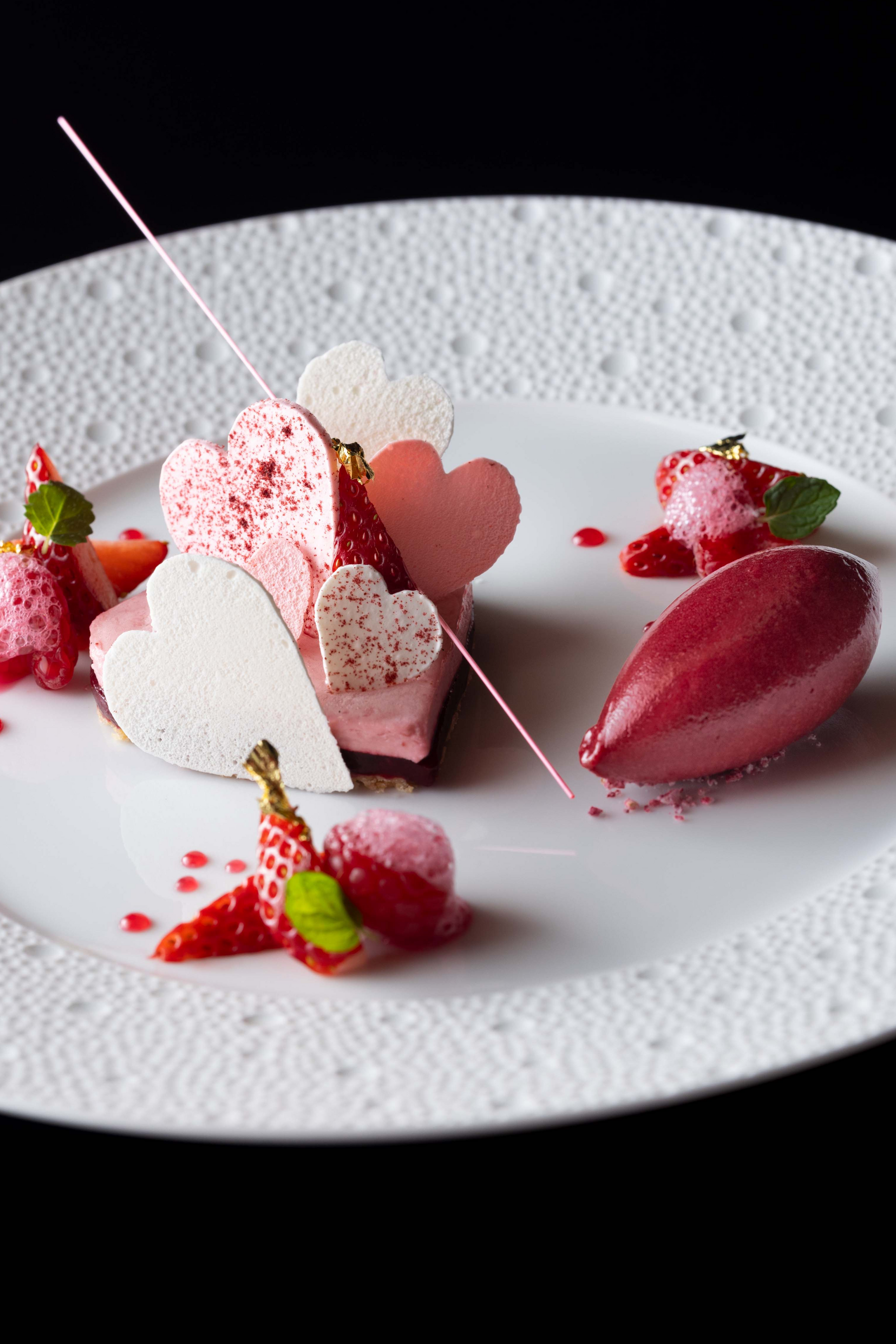 ● デザート「ハートのヴァシュラン 苺と赤い果実のムース マリー・アントワネット ティー香るソースを合わせて」は苺とフランボワーズ、ブラックベリーなど様々なベリーを使った芸術的な一皿です。