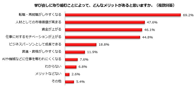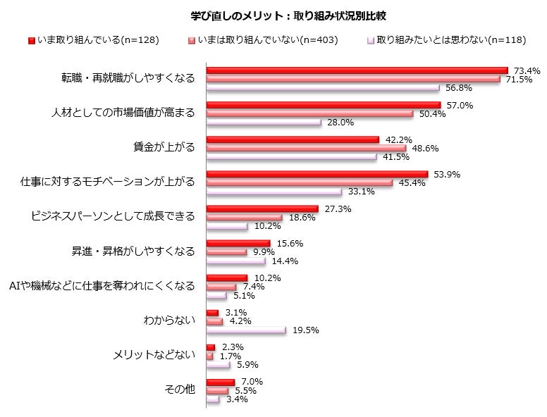 3.学び直しのメリット「転職・再就職しやすくなる」69.2%/取り組み状況別比較
