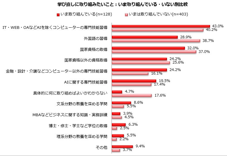 2.「IT・WEB・OAなどの技能」40.9%/いま取り組んでいる・いない別比較