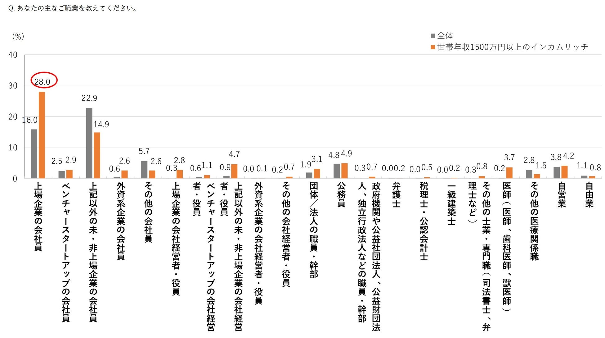 インカムリッチの過半数(51.0%)が会社員、約3割(28.0%)が上場企業に勤務。