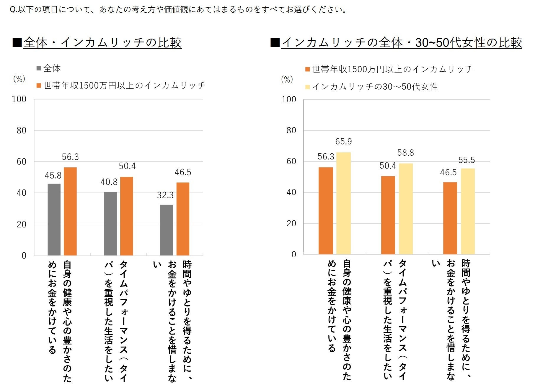 インカムリッチでは、「健康や心の豊かさのためにお金をかけている」(56.3%)、「タイムパフォーマンスを重視」(50.4%)、「ゆとりを得るためにお金をかけることを惜しまない」(46.5%)のいずれの項目も、全体より10pt前後高い。