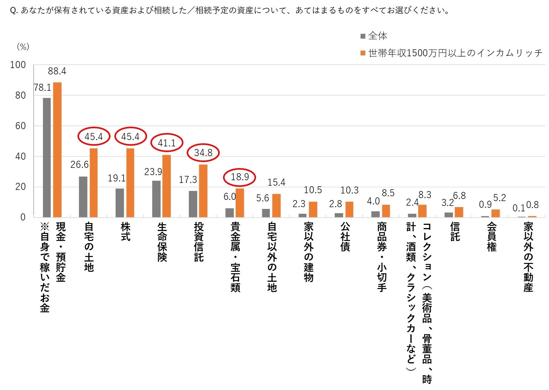 また、インカムリッチの約4割が「自宅の土地」(45.4%)や「株式」(45.4%)、「生命保険」(41.1%)を保有。「投資信託」(34.8%)や「貴金属・宝石類」(18.9%)を保有する人も、全体より10ポイント(以下pt)以上高い。