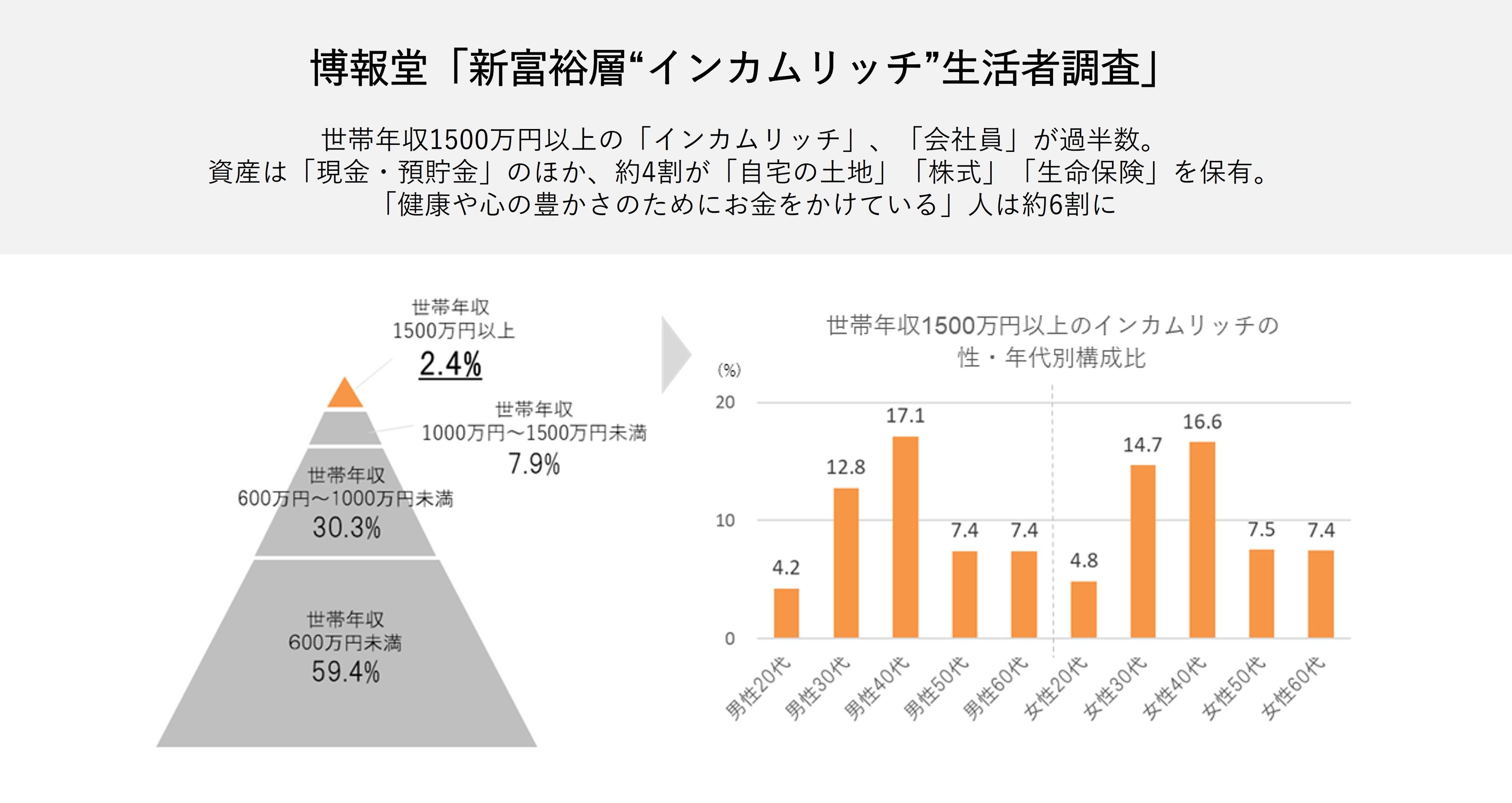 世帯年収1500万円以上の「インカムリッチ」「会社員」が過半数。資産は「現金・預貯金」のほか、約4割が「自宅の土地」「株式」「生命保険」を保有。「健康や心の豊かさのためにお金をかけている」人は約6割に