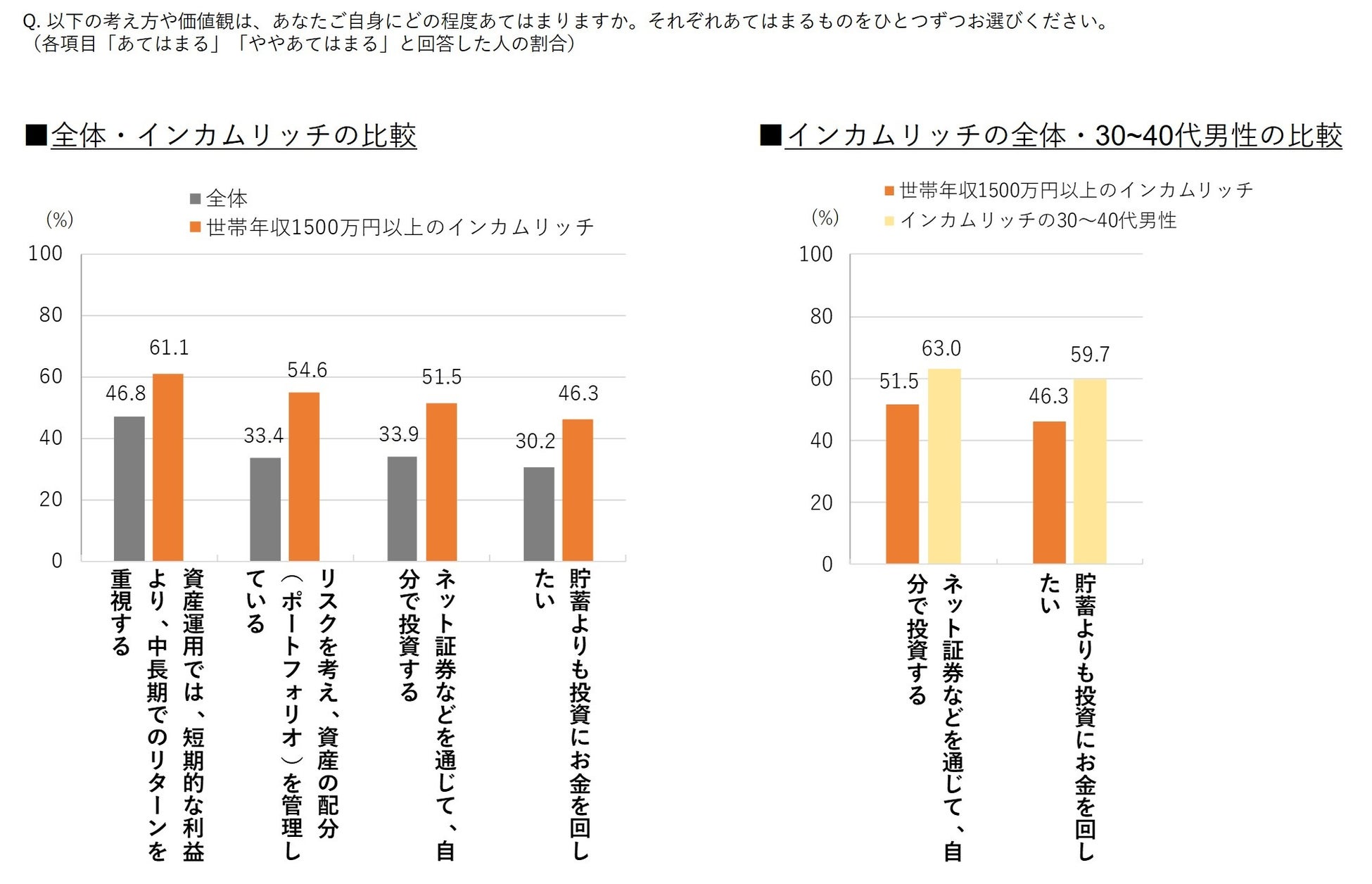 インカムリッチの中でも、特に30~40代男性は、「ネット証券などを通じて自分で投資」(63.0%)、「貯蓄よりも投資にお金を回したい」(59.7%)という意識が6割前後と高く、投資への意欲が高いことがうかがえる。