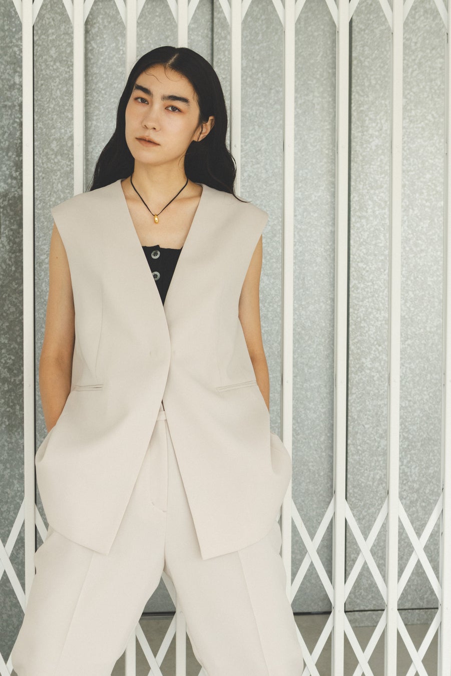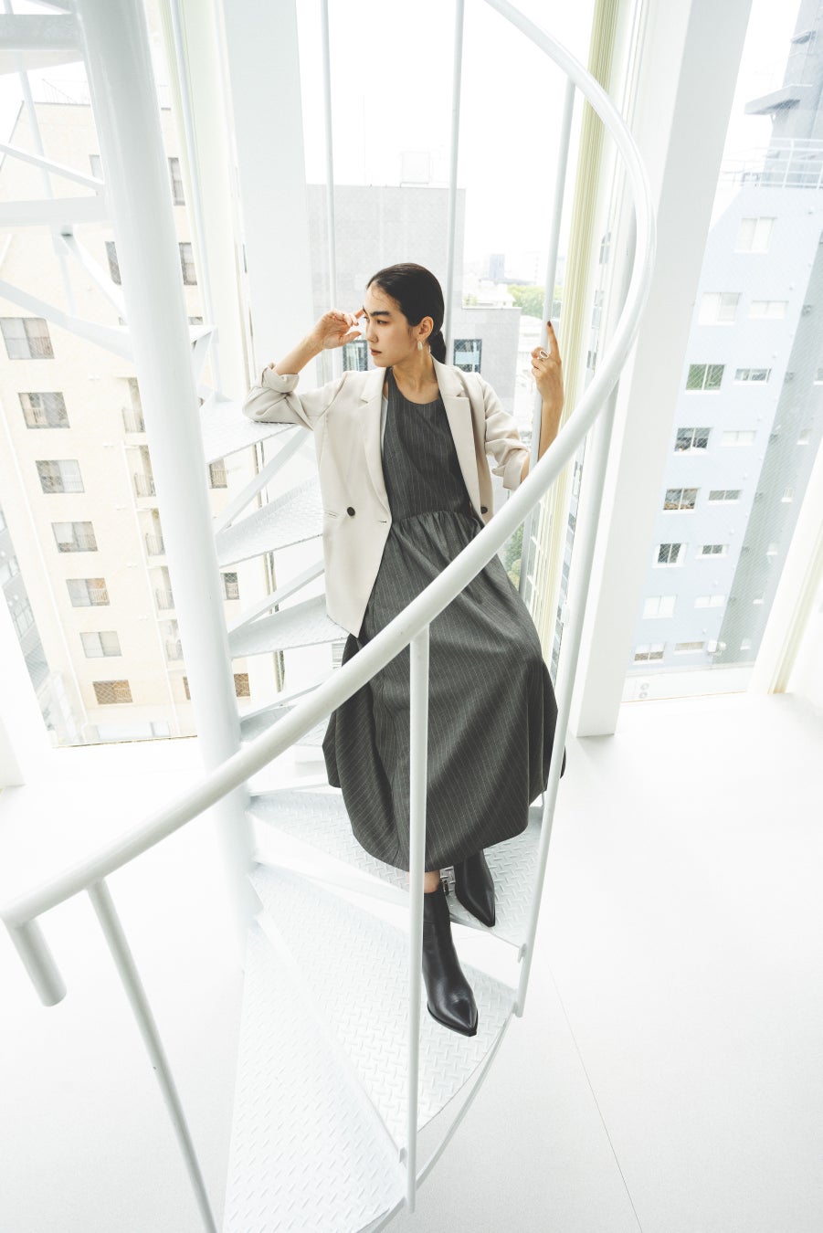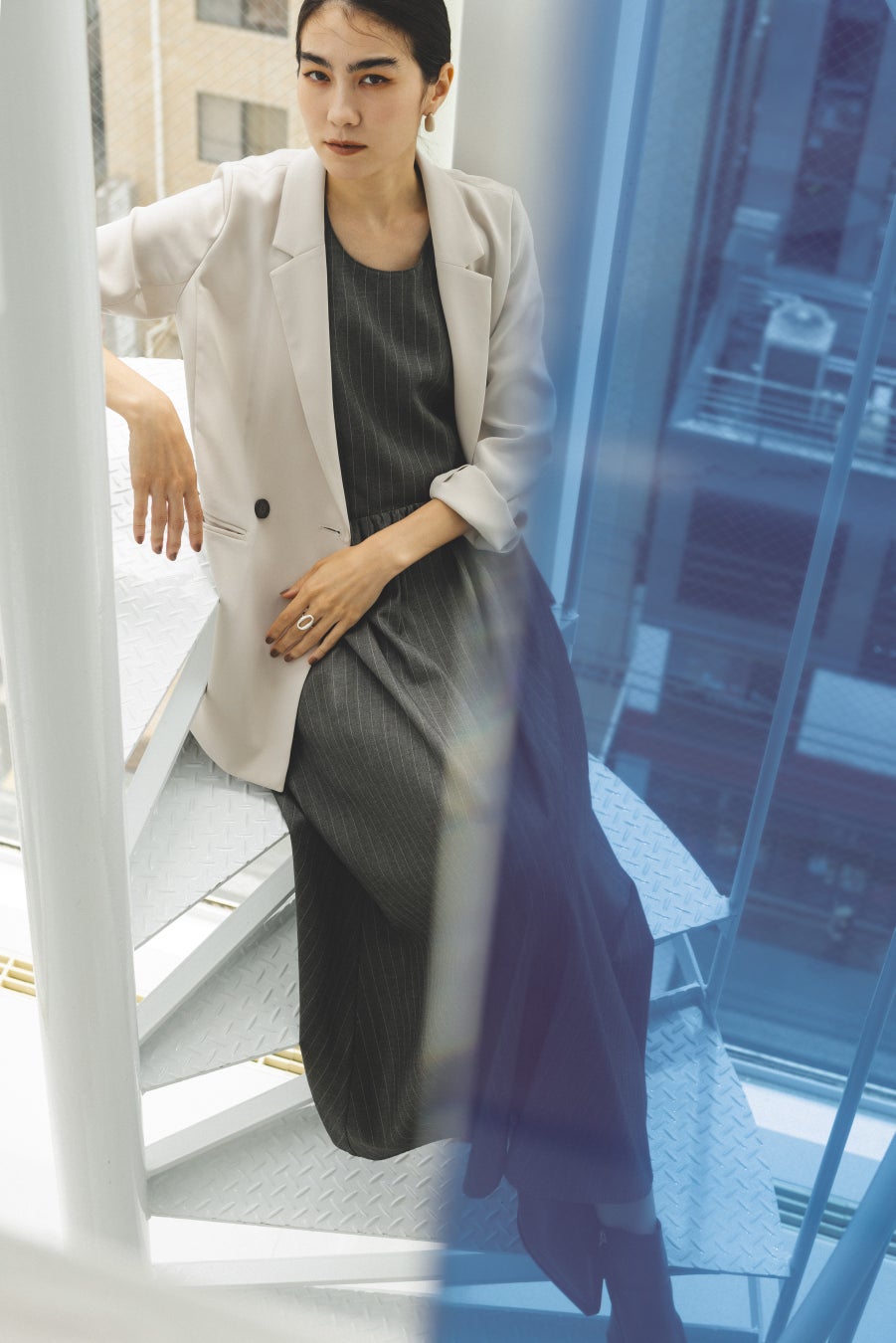 ダブルジャケット、ラペルレスジレ、テーパードパンツ、Vネックワンピースの4型展開。