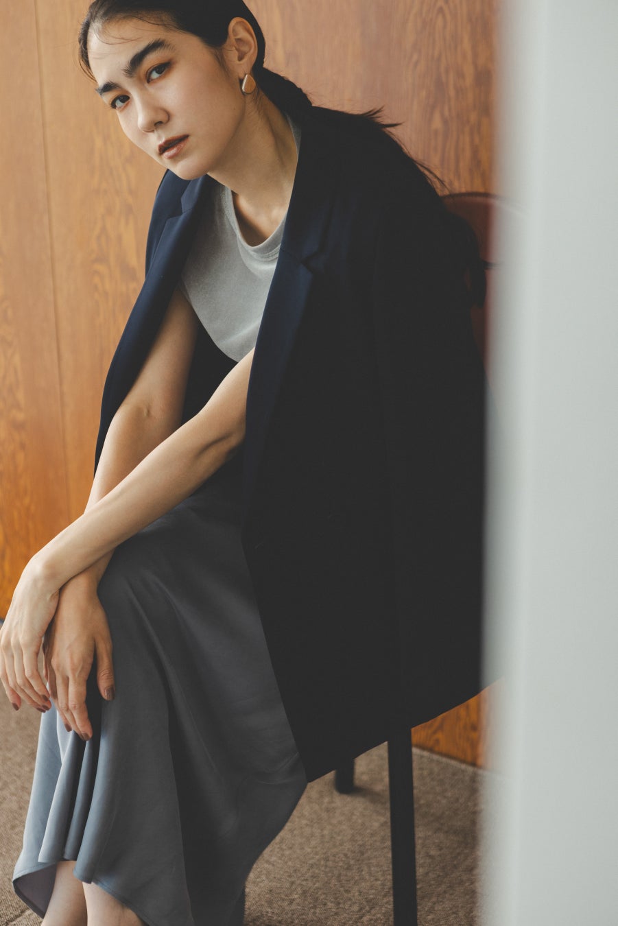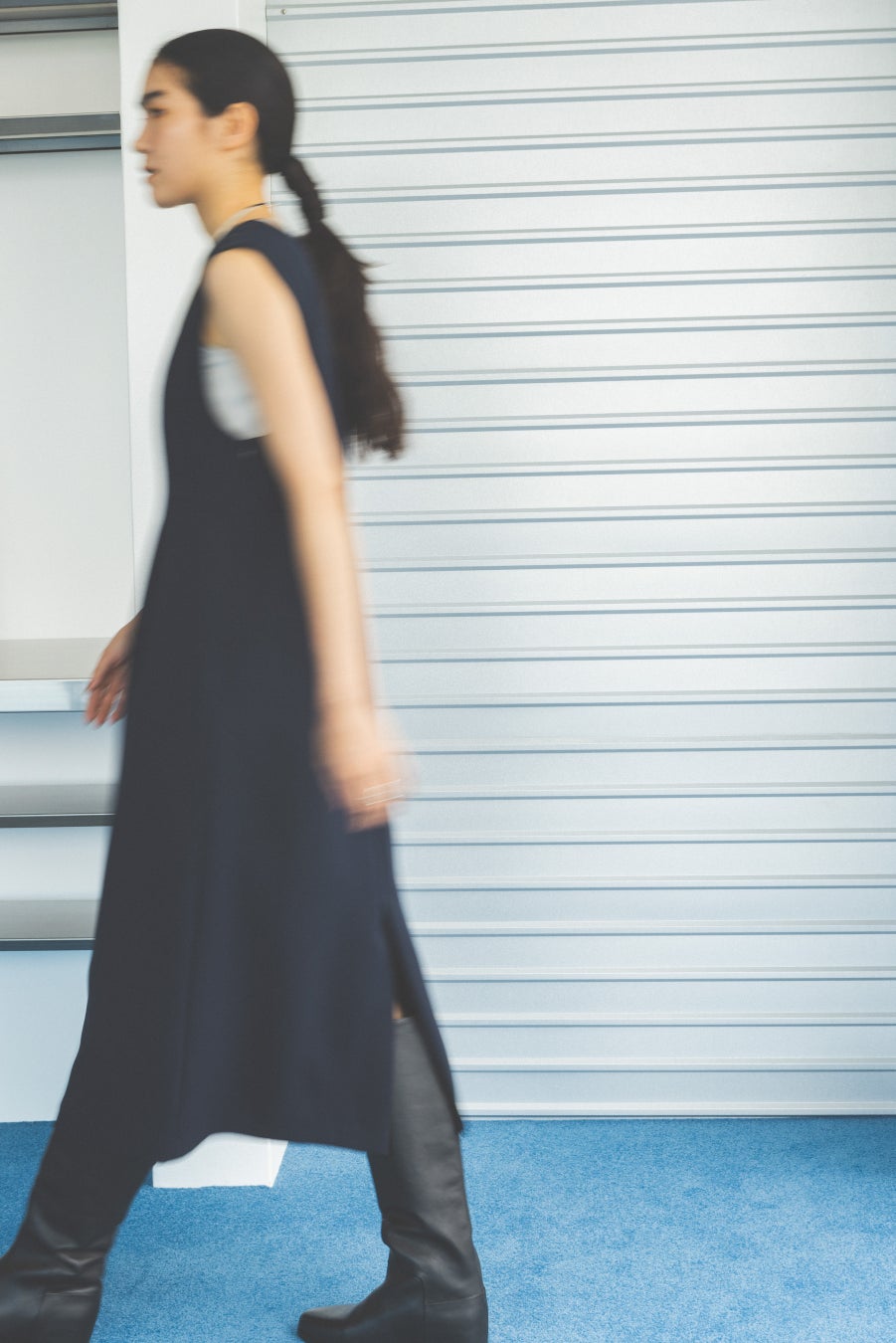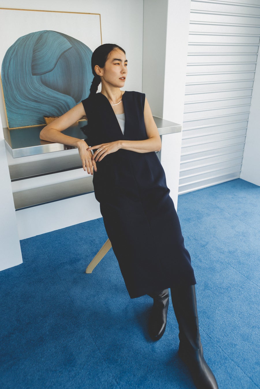 ダブルジャケット、ラペルレスジレ、テーパードパンツ、Vネックワンピースの4型展開。
