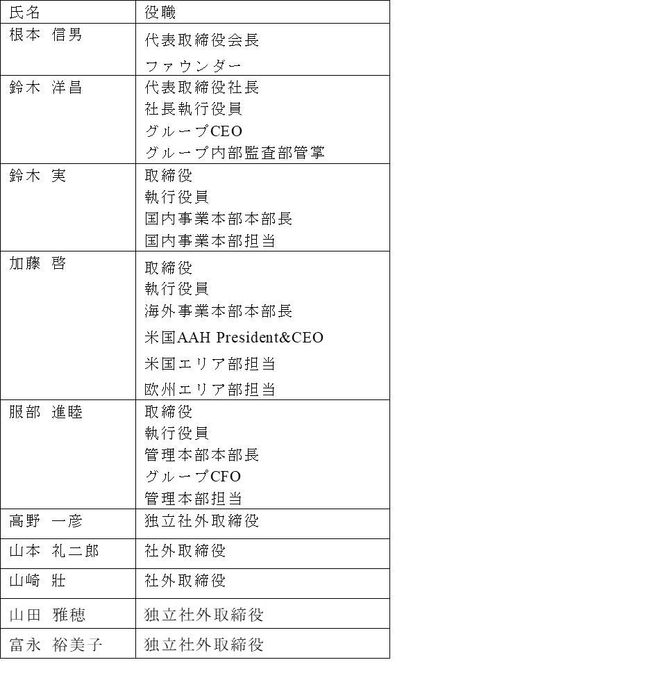 東 勝信 | 執行役員 総務部部長 総務部担当 法務部担当 グループ知的財産室担当 リスク管理室担当 店舗開発部担当 | 執行役員 人事総務統括部長 総務部部長 人事部担当 総務部担当 店舗開発部担当 |