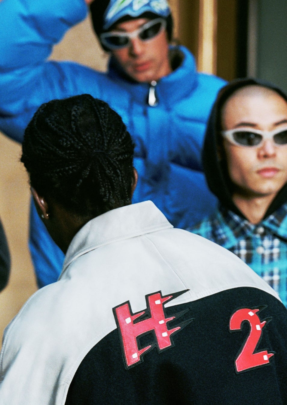 唯一無二でありながら実用的なフィット感、そして多目的性に焦点を当てたH2 Drop 2は、ファッションへのより循環的なアプローチを後押しし、新しい形のデイリーウェアを提案します。本ラインナップの主役となるスタイルには、1990年代から2000年代初頭にかけてニューヨークのストリートで見かけた服を連想させる、カラフルなホッケー・ジャージーやレザースタジャンのようなスポーティなシルエットの数々が登場します。さらに、ラインストーンをあしらったデニム・コルセットとお揃いのジーンズ、カットアップしたグラフィックTシャツをつなぎ合わせたパッチワークのロングスリーブ、万能なカーキのボンバージャケットなどが目を引くアイテムとなっています。