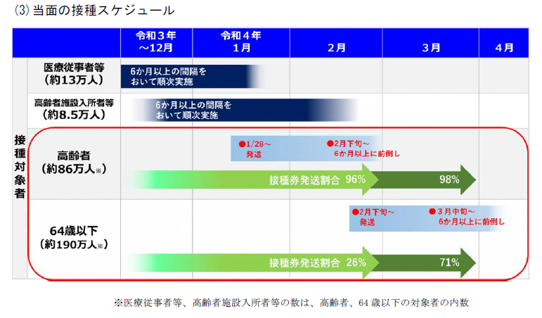 新型コロナウイルスワクチンの追加接種(3回目接種)について、国から接種間隔の前 倒しに関する新たな方針(厚生労働省事務連絡(令和4年1月 13 日付))が示されました。