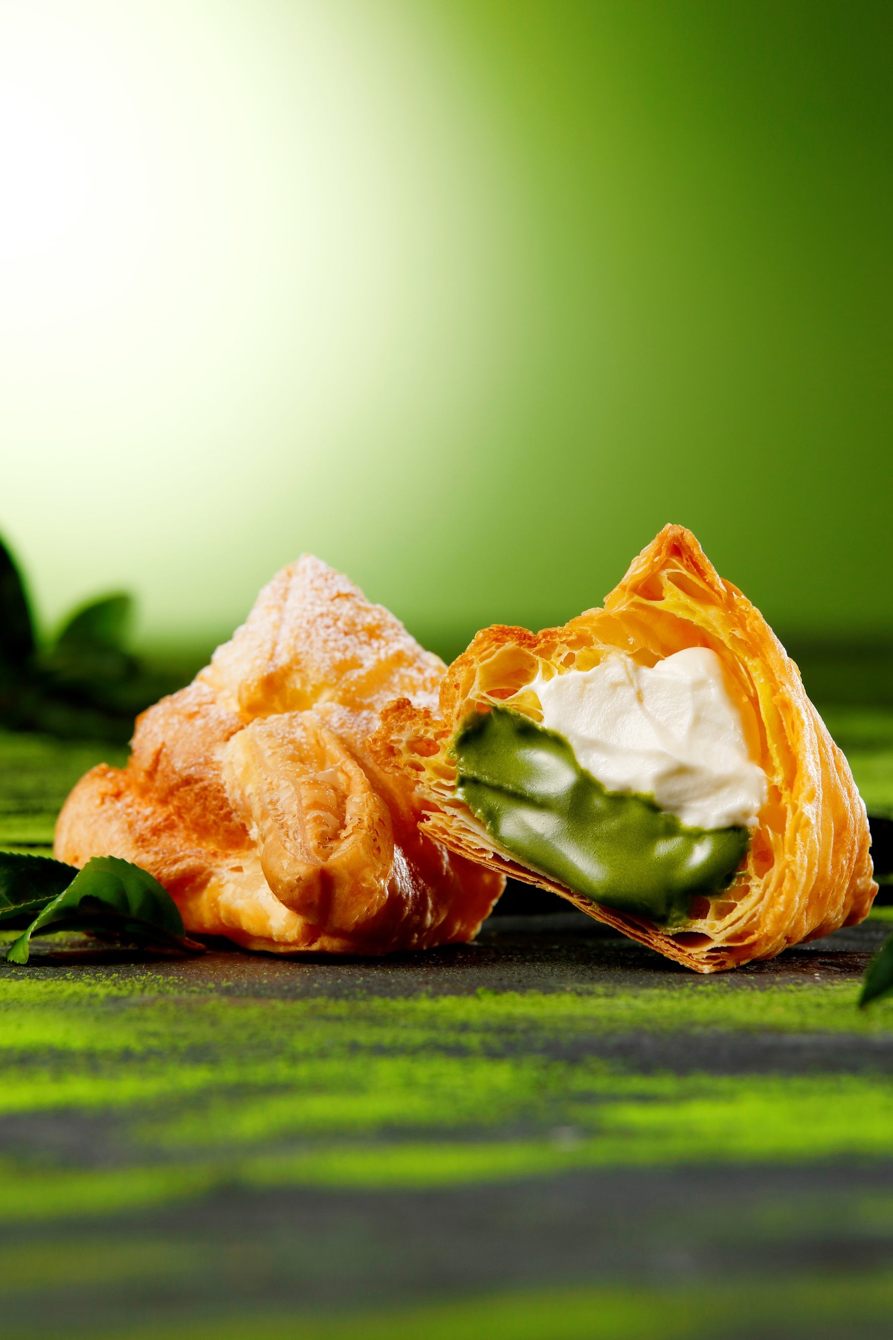 オーブンで焼き上げたサックサクのパイに、宇治抹茶クリームと北海道ミルククリームの2つのクリームを合わせました。宇治抹茶クリームは、抹茶香るほんのり苦みのある味わいに。北海道ミルククリームは、北海道産生クリーム、マスカルポーネチーズ、練乳で仕立てたまろやかな味わいに仕上げました。