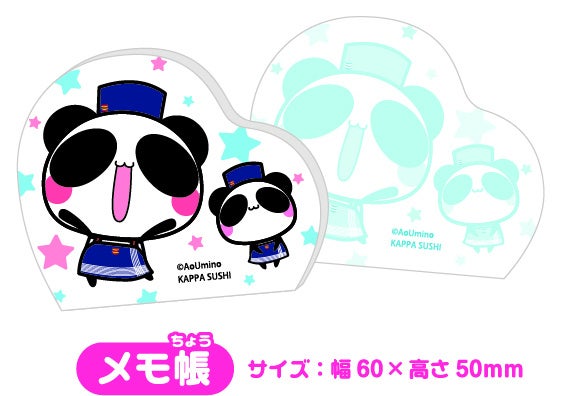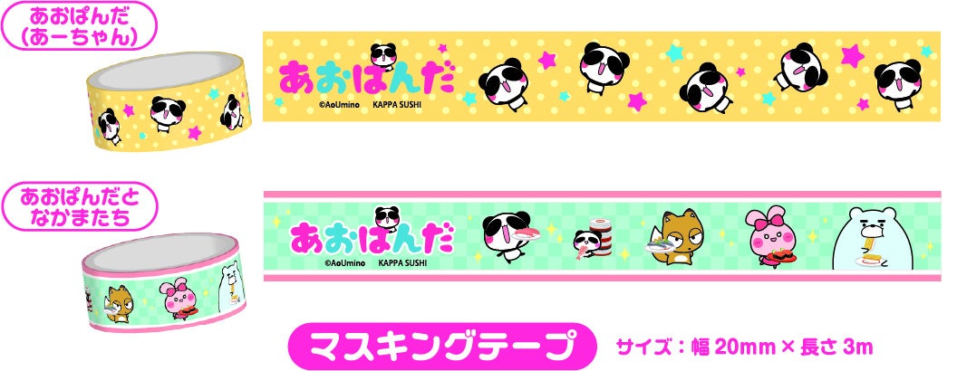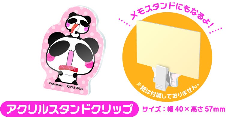 今回、かっぱのカプセルトイでもらえるのは、可愛らしいパンダのキャラクター『あおぱんだ』とコラボレーションした、かっぱ寿司限定のアイテムです。パンダのあーちゃんとおーちゃんが仲良くプリントされた「メモ帳」やメモスタンドとしてもご利用いただける「アクリルスタンドクリップ」、あーちゃんやそのなかまたちが溢れる「マスキングテープ(全2種類)」の全4種です。(※アイテムの種類はお選びいただけません。)