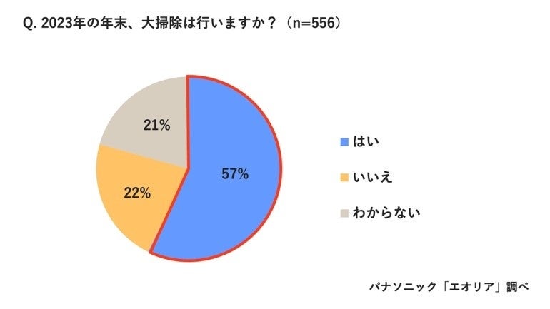 「2023年の年末、大掃除は行いますか?」という質問では、「はい」(57%)、「いいえ」(22%)、「わからない」(21%)という結果に。