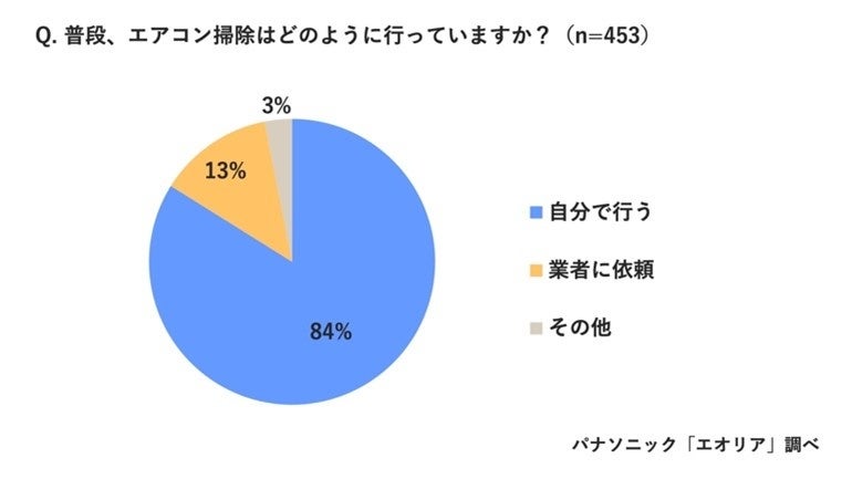 エアコン掃除については、「自分で行う」が最多の84%、「業者に依頼」が13%という結果になりました。
