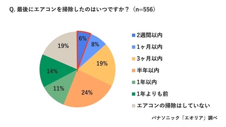 続いて、エアコンのお掃除について調査を行いました。「最後にエアコンを掃除したのはいつですか?」という質問では、「半年以内」が最多の24%、続いて「3ヶ月以内」と「エアコンの掃除はしていない」が19%という結果に。フィルターの自動お掃除機能がないエアコンの場合、メーカーは目安として2週間に1度の掃除を推奨していますが、「2週間以内」と回答した方はわずか6%と、回答の中で最も少ない割合となりました。